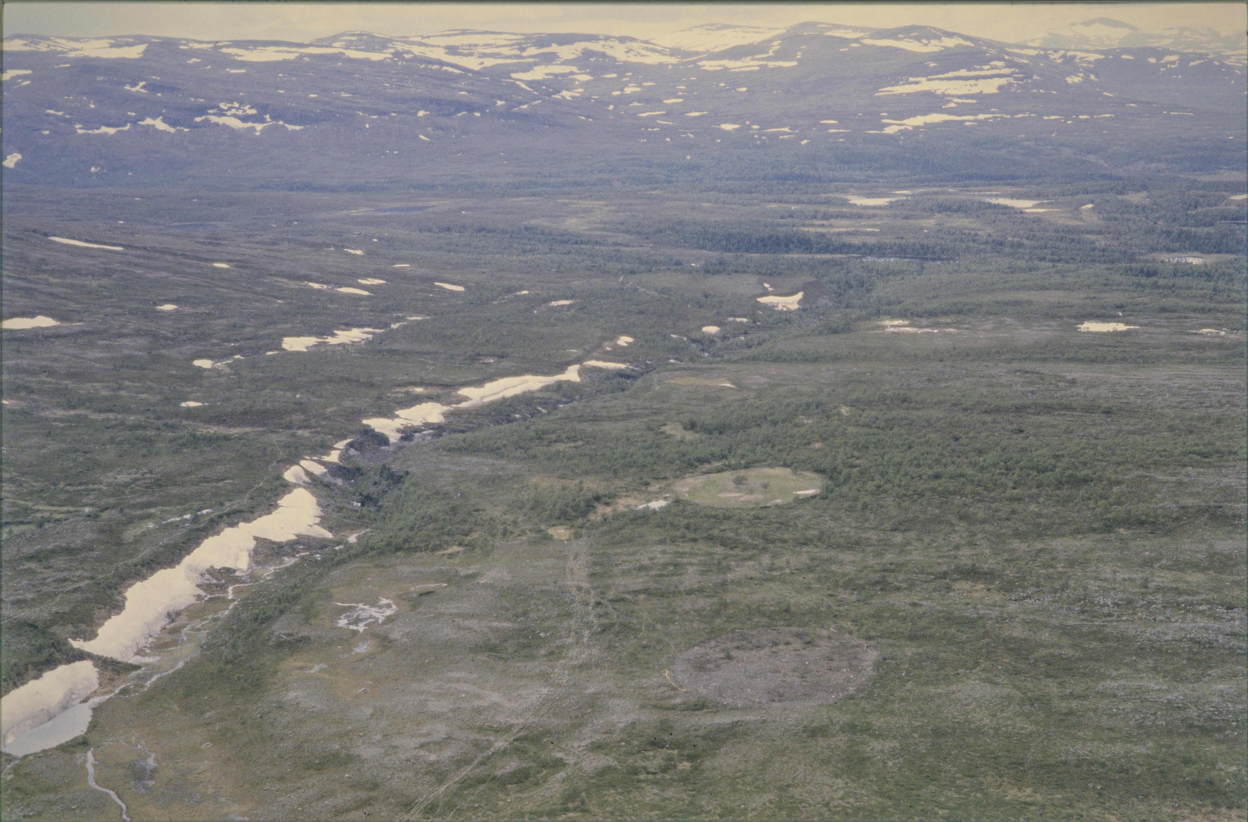 Beskrivning: Dalgång mellan fjällen Stor-Gröngumpen (Suenjere) och Lill-Gröngumpen (Joevaarta), norr om Lunndörrsfjällen. Vid bildens mitt sameviste med rengärden. Nere till höger rengärde RAÄnr Undersåker 455 m.m. Bilden är tagen mot (väderstreck): SV