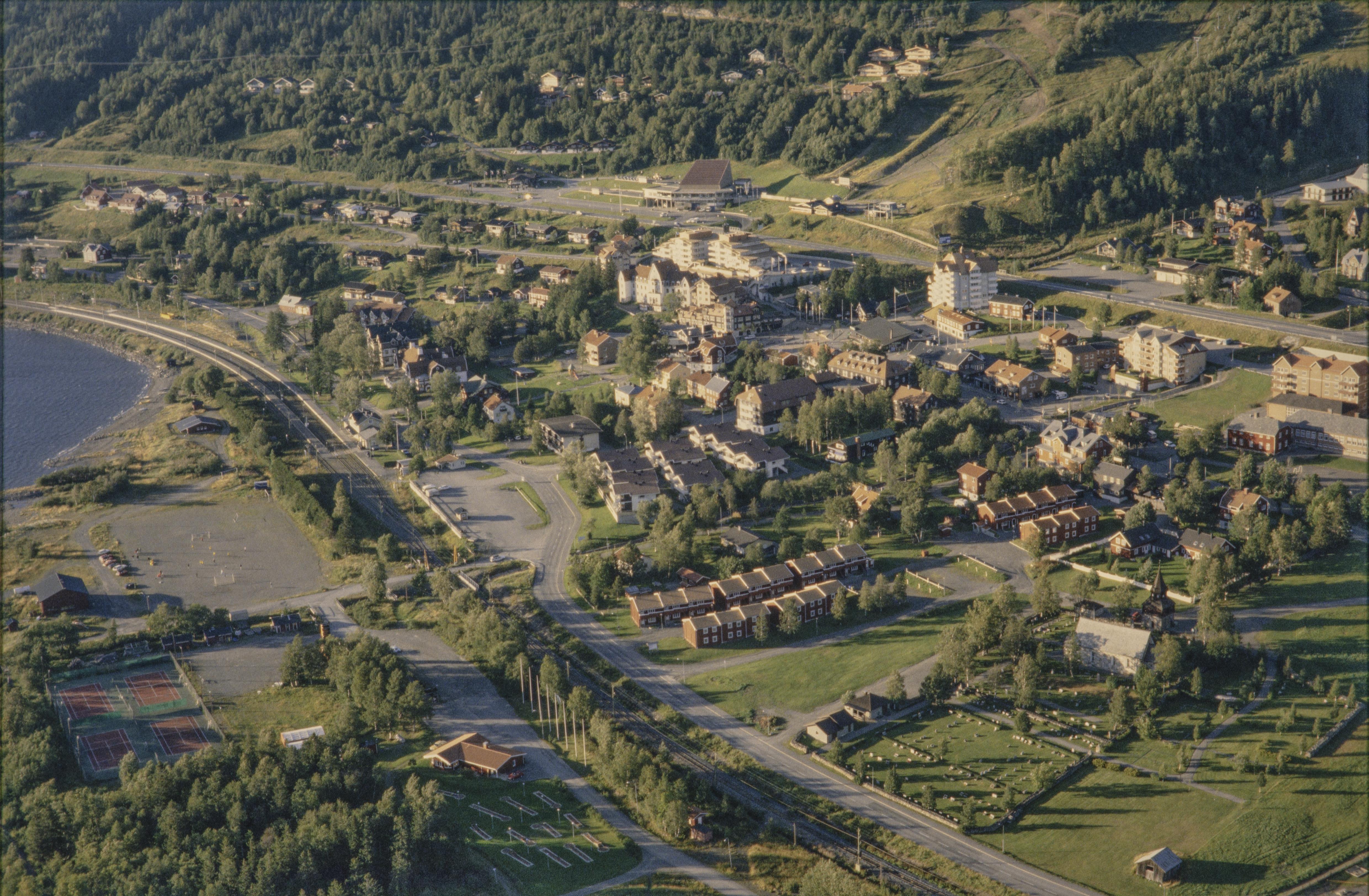 Beskrivning: Åre tätort, turistort och kyrkby vid Indalsälven. Vid bildens mitt Åre gamla kyrka. Vid kyrkan minnessten RAÄnr Åre 16:1. Bilden är tagen mot (väderstreck): NNV