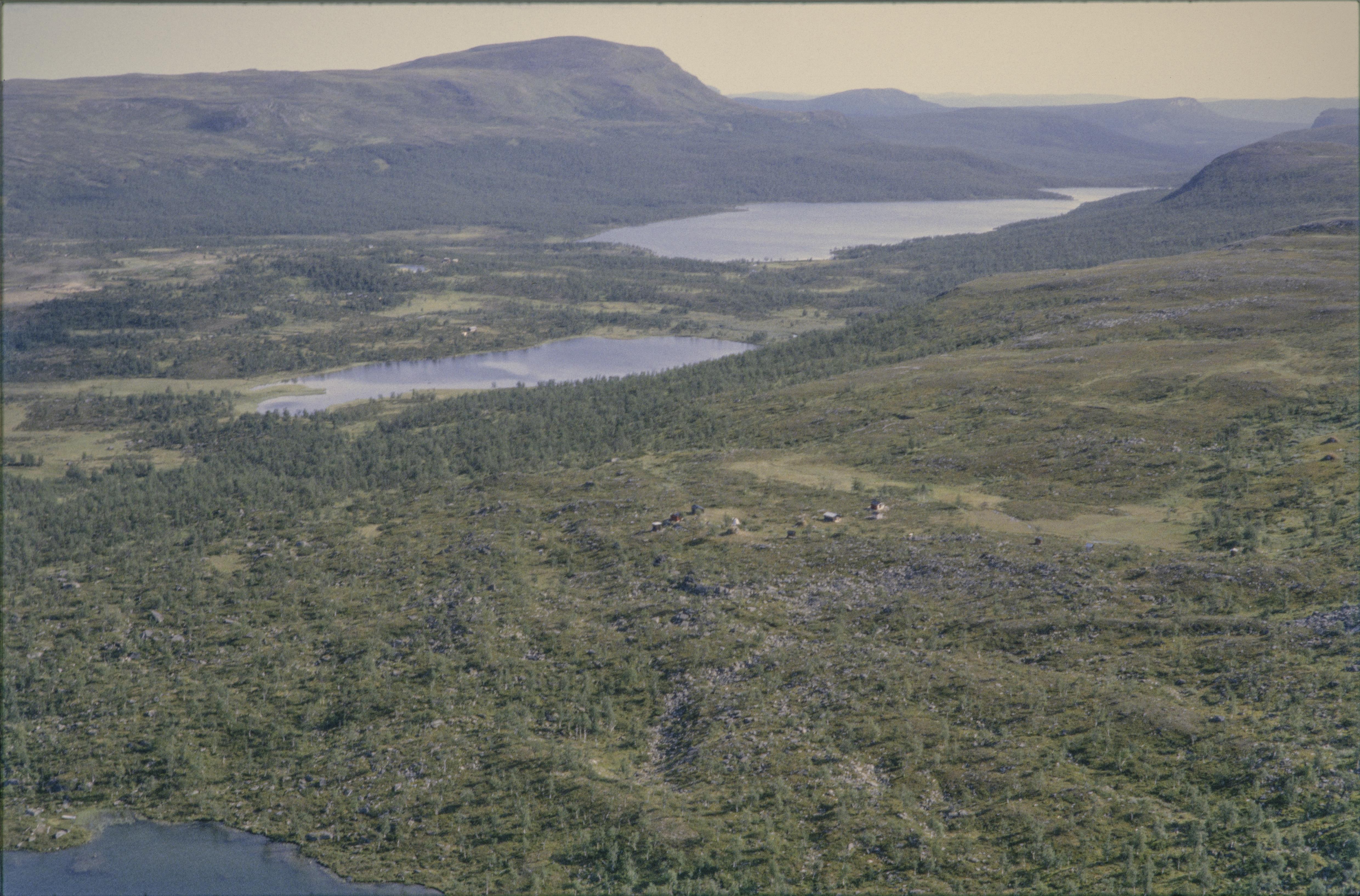 Beskrivning: Samevistet Parka (Bárkka) mellan sjöarna Jiervajávrátj (nere till vänster) och vid bildens mitt Unna Parkajaure (Unna Bárkájávrre). Uppe till höger sjön Parkajaure (Bárkájávrre). Gränsen mot socknet Jokkmokk går över bildens mitt. Vid sockengränsen fångstgropssystem RAÄnr Arjeplog 327:1 och rengärden. Bilden är tagen mot (väderstreck): NO