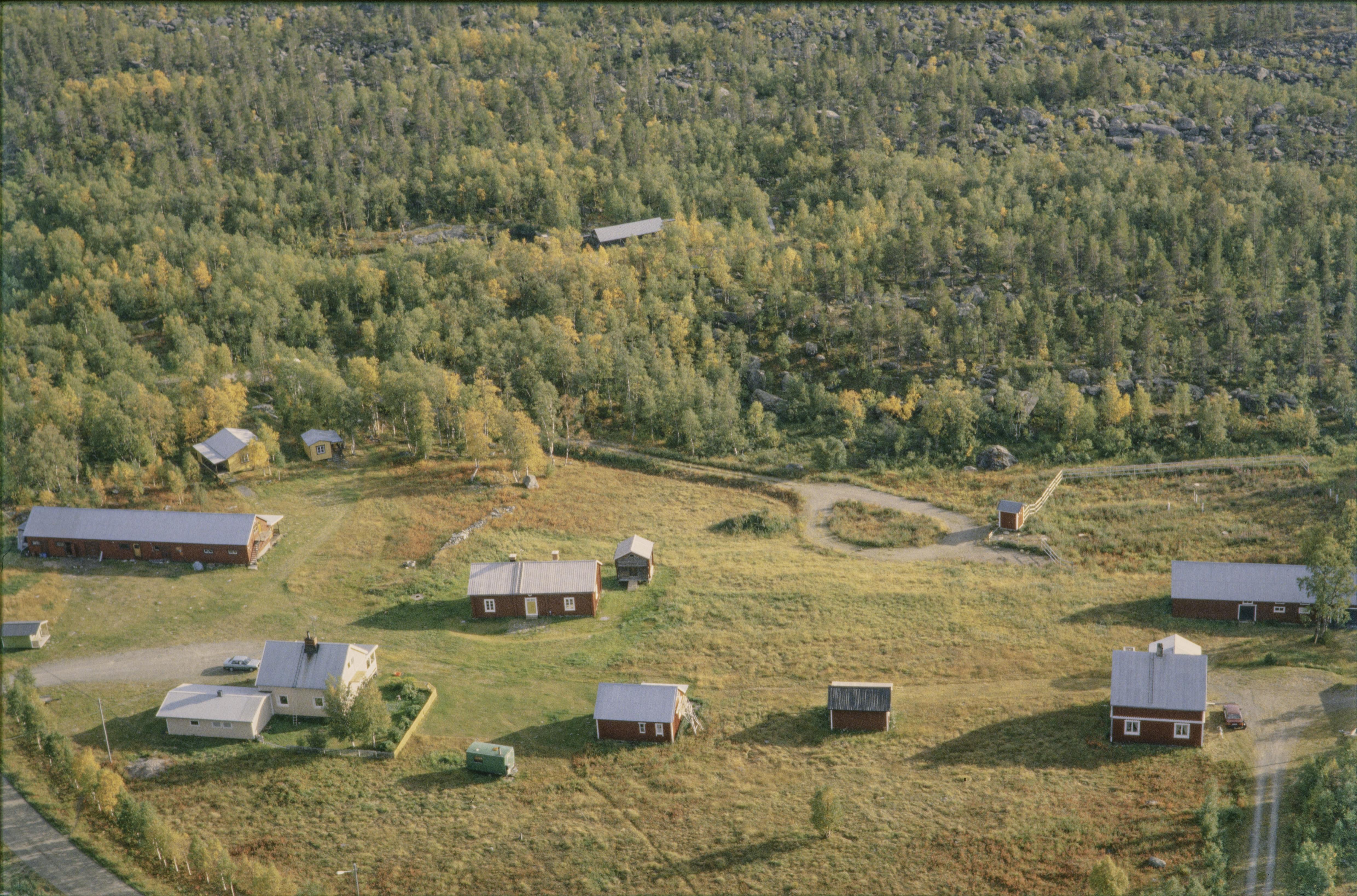Beskrivning: Adolfsström (skrivs även Adolfström) by och f.d. bruk mellan sjöarna Lárvvejávrre och Mittisjön (Gasskajávrre) vid Laisälven (Lájsso). Vid bildens mitt bruksgården Majorsgården i hyttområde RAÄnr Arjeplog 566:1, m.m. Bilden är tagen mot (väderstreck): S