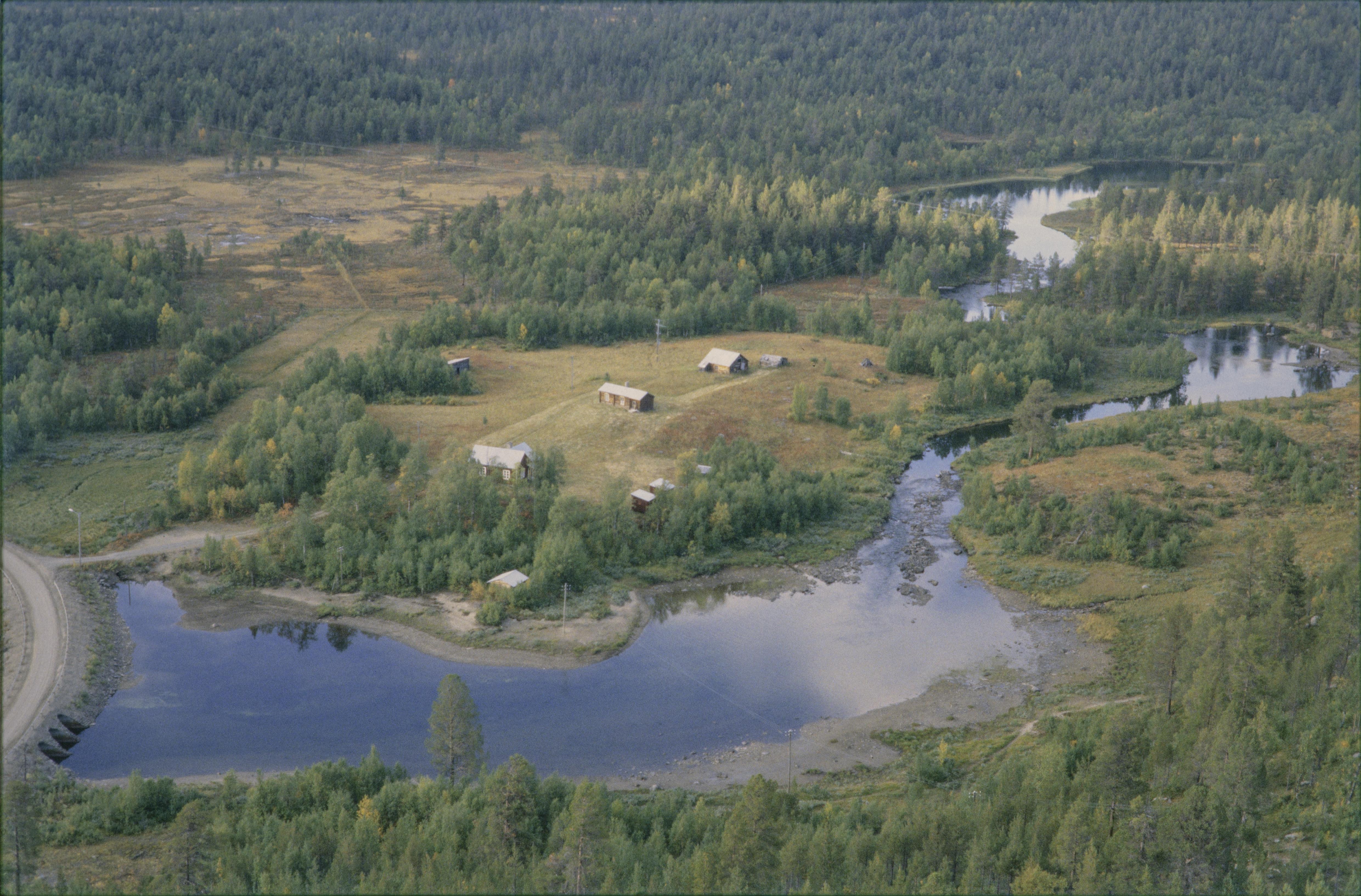 Beskrivning: Området Viejenäs i östra ändan av Gautosjön (Gávttojávrre / Gautojaure) och dalgången Laisälven (Lájsso). Boplatser RAÄnr Arjeplog 559:1 och 560:1. Ån Viejeströmmen till höger. Till vänster längs ån fångstgrop RAÄnr Arjeplog 964:1. Bilden är tagen mot (väderstreck): NV