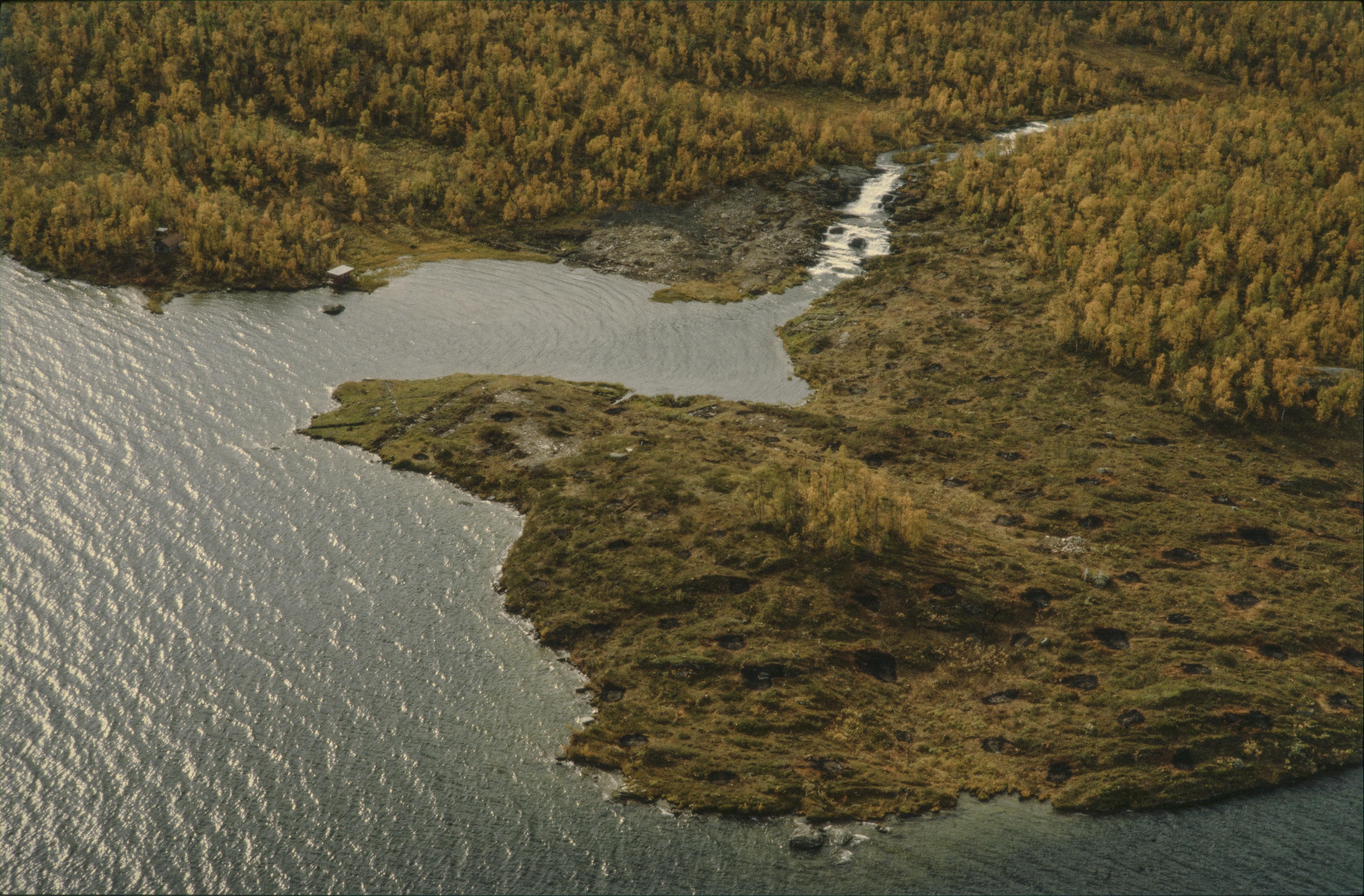 Beskrivning: Silbojokks silverhytta i nordvästra ändan av sjön Sädvajaure (Sädvvájávrre). Uppe till höger utloppet av ån Silbojokk (Silbbajåhkå). Vid utloppet hyttlämningar efter Nasafjälls silververk RAÄnr Arjeplog 368:1, boplats Arjeplog 296:1 och begravningsplats Arjeplog 4232. Bilden är tagen mot (väderstreck): VSV