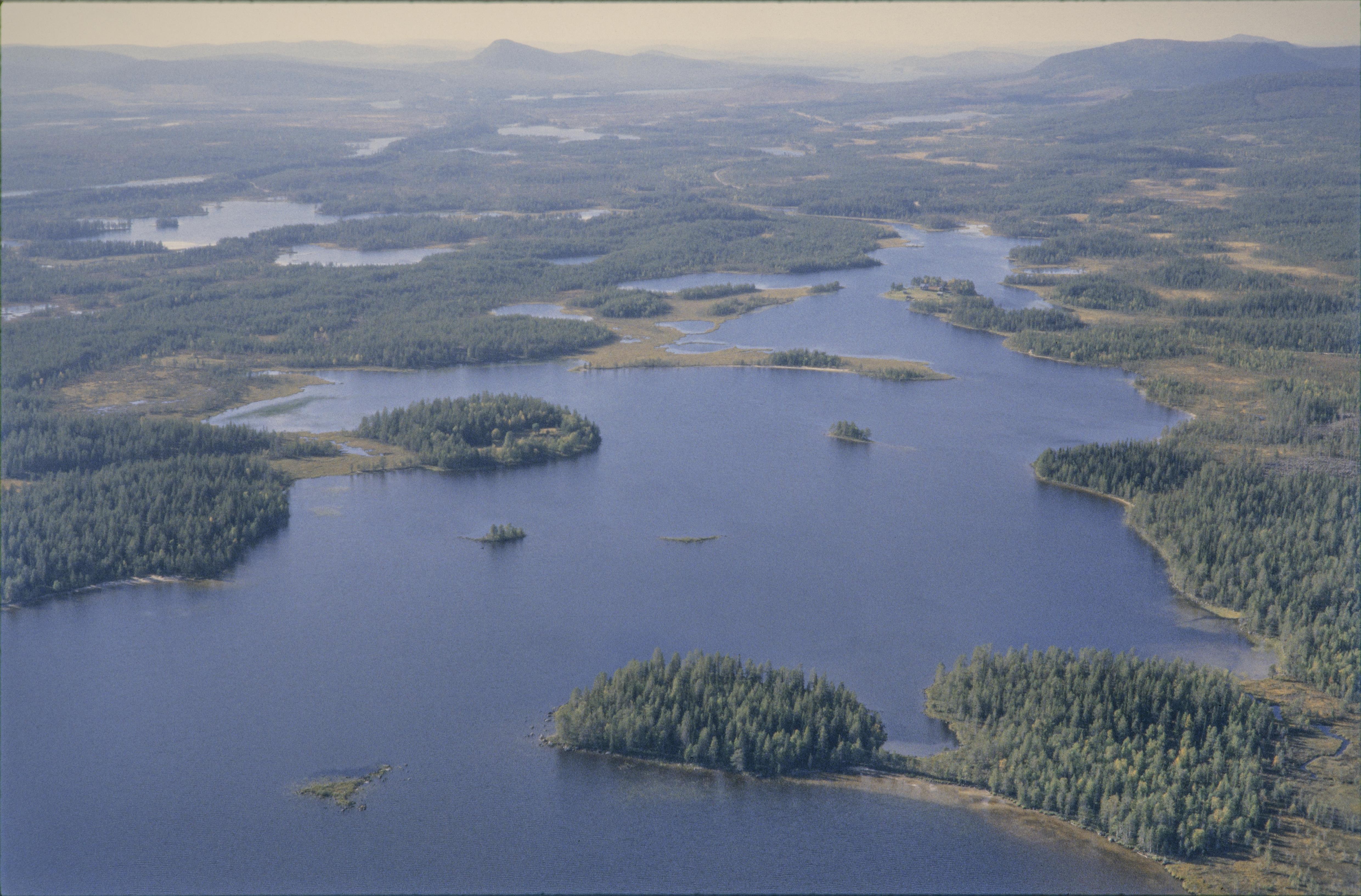Beskrivning: Sjön Tallträsk. Över udden till vänster om bildens mitt boplats RAÄnr Arvidsjaur 199:1. Avaviken m.m. till höger i bildens övre kant. Bilden är tagen mot (väderstreck): VNV