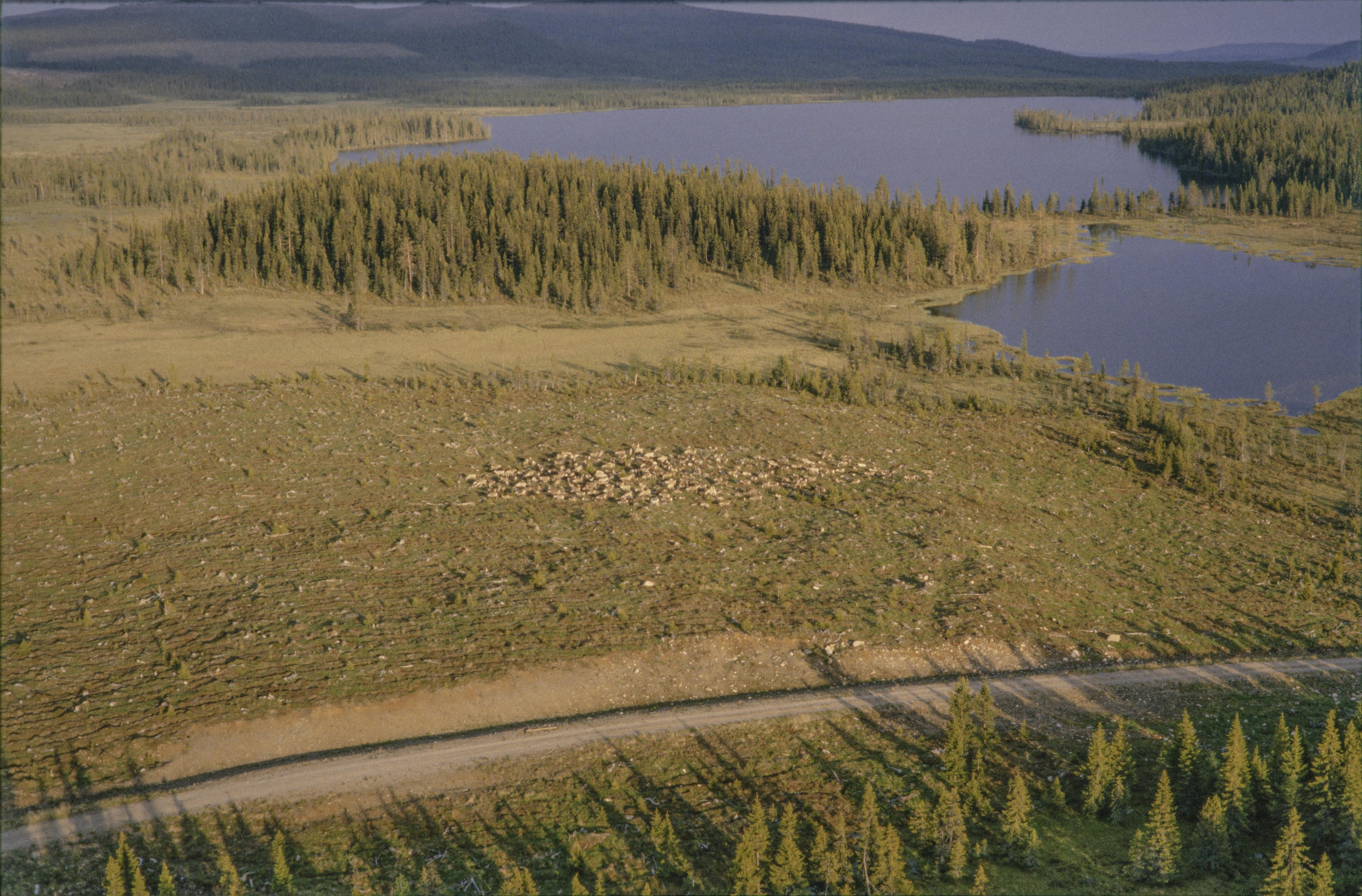 Beskrivning: Geijaurevallen, en renvall vid sjön Geijaure (Giejjure). Geijaurmyran med renhjord vid bildens mitt. Bilden är tagen mot (väderstreck): SSO