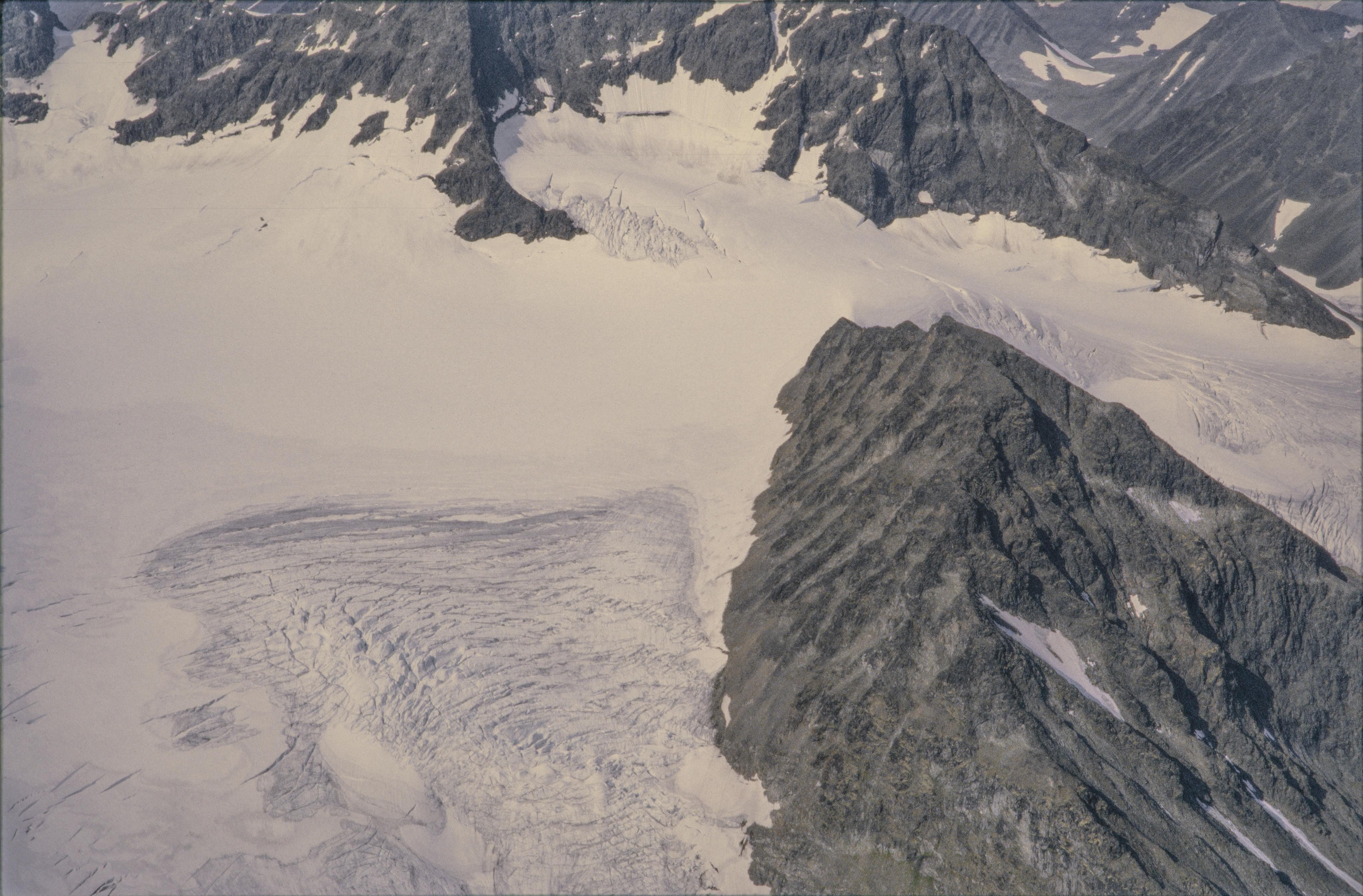 Beskrivning: Fjället Kebnekaise (Giebmegáisi). Isfallsglaciären nordöst om Nordtoppen. Fjälltoppen Giebmebákti i bildens övre kant, Bilden är tagen mot (väderstreck): V