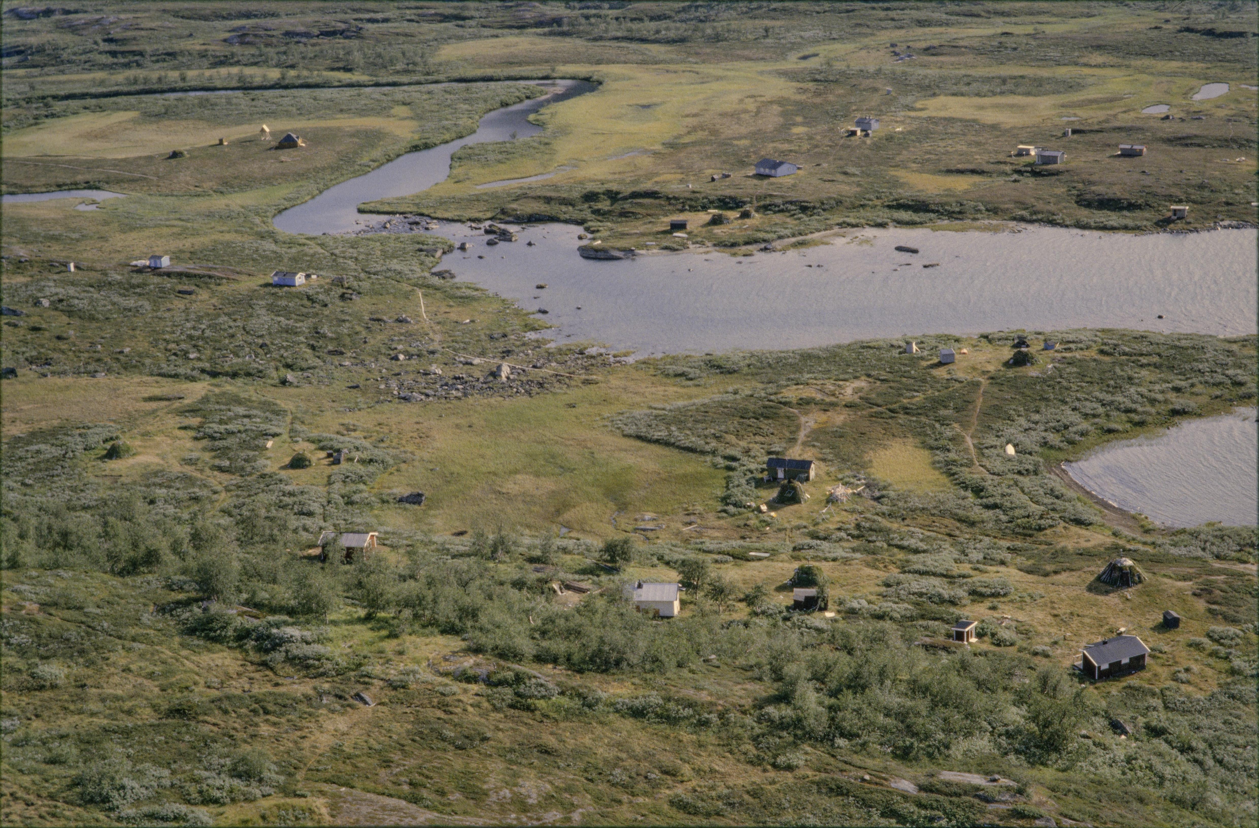 Beskrivning: Arasluokta (Árasluokta) sameviste i östra delen av sjön Virihaure (Virihávrre). Uppe till vänster Arasluokta kapell och en härd RAÄnr Jokkmokk 3378:1, m.m. Området ingår i Padjelanta (Badjelánnda) nationalpark och världsarvet Laponia. Bilden är tagen mot (väderstreck): S