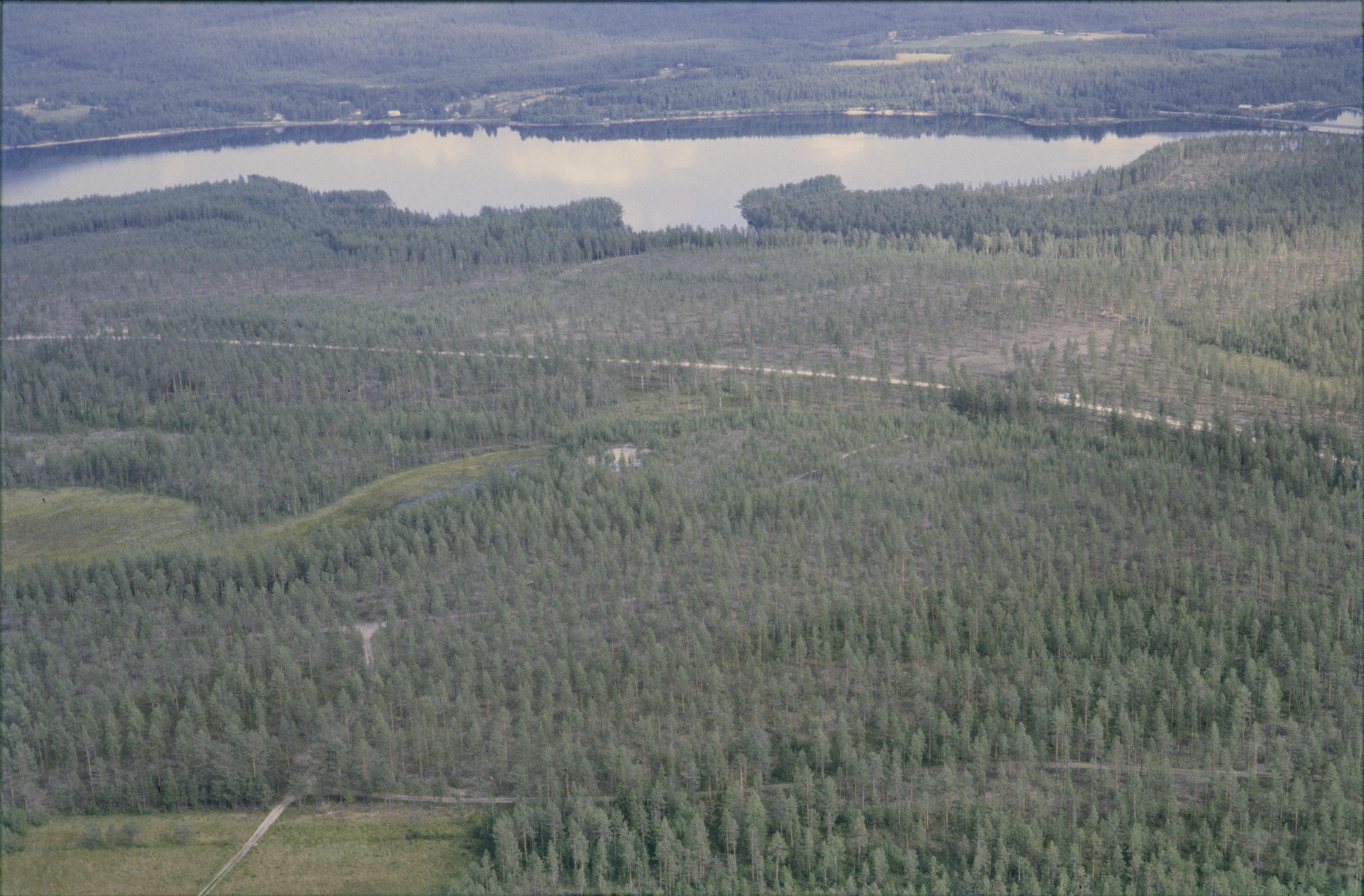 Beskrivning: Till vänster under bildens mitt Vuollerimboplatsen, en stenåldersboplats med hyddbotnar och fångstgrop RAÄnr Jokkmokk 1292:1-2 norr om tätorten Vuollerim (Vuolleriebme). Vid boplatsen härd RAÄnr Jokkmokk 4935 och 4936. Stora Luleälven (Stuor Julevädno) i bildens övre del. Bilden är tagen mot (väderstreck): Ö