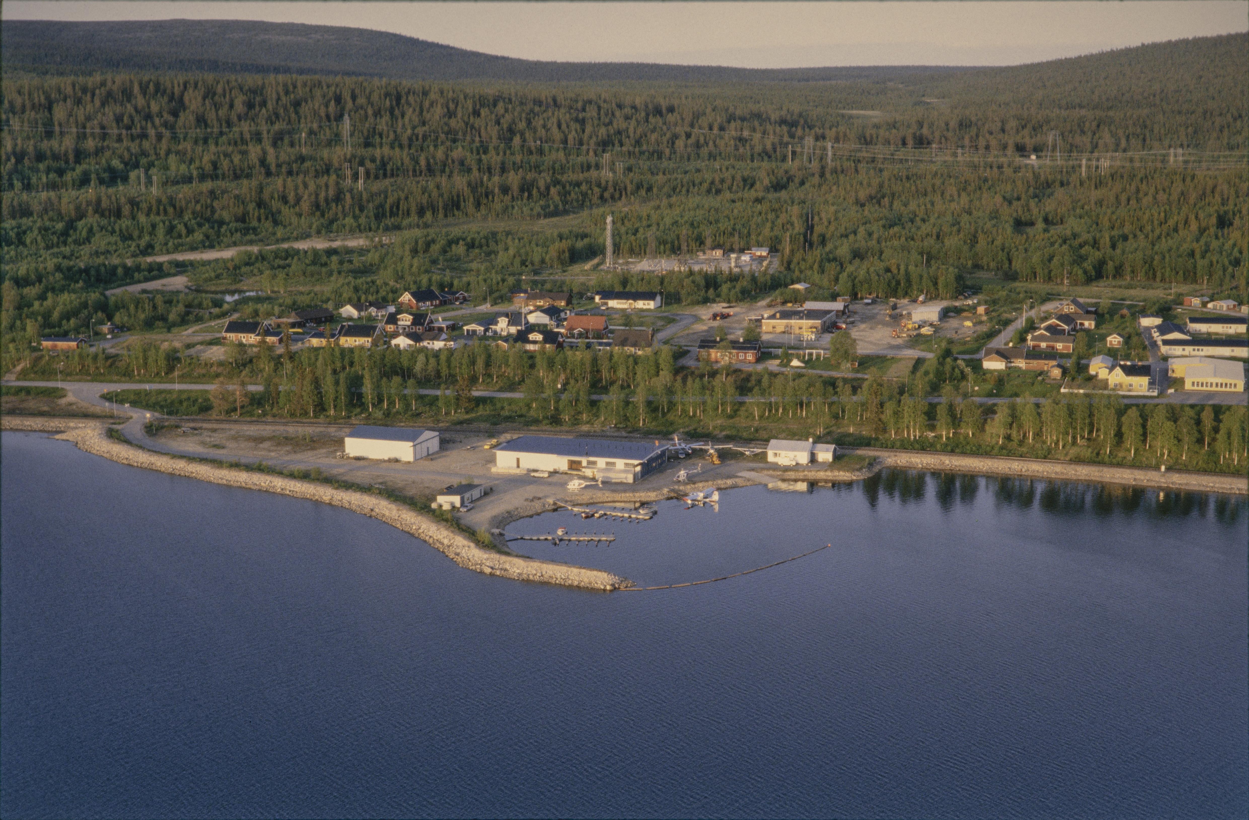 Beskrivning: Porjus (Bårjås) tätort och kraftverkssamhälle vid sjön Stora Lulevatten (Stuor Julevu) och Stora Luleälven (Stuor Julevädno). Porjus flyghamn i bildens mitt. Över bildens mitt rengärde RAÄnr Jokkmokk 1745:1. Bilden är tagen mot (väderstreck): Ö