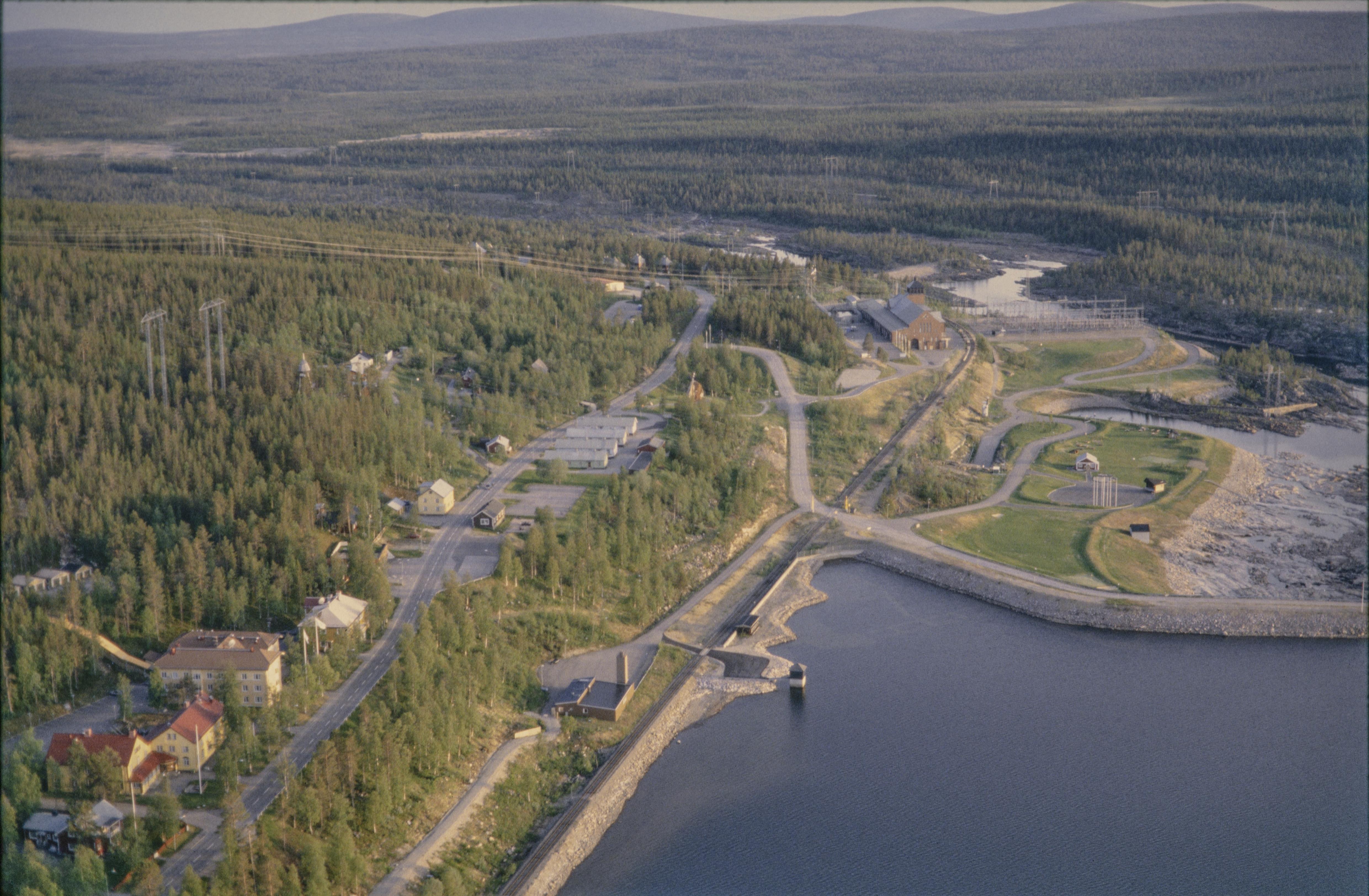 Beskrivning: Porjus (Bårjås) tätort och kraftverkssamhälle vid sjön Stora Lulevatten (Stuor Julevu) och Stora Luleälven (Stuor Julevädno). Porjus kraftverk (nya och gamla) och minnesmärke RAÄnr Jokkmokk 1750:1 över bildens mitt. Porjus gamla kraftverk är byggnadsminne och industriminne. Bilden är tagen mot (väderstreck): VSV