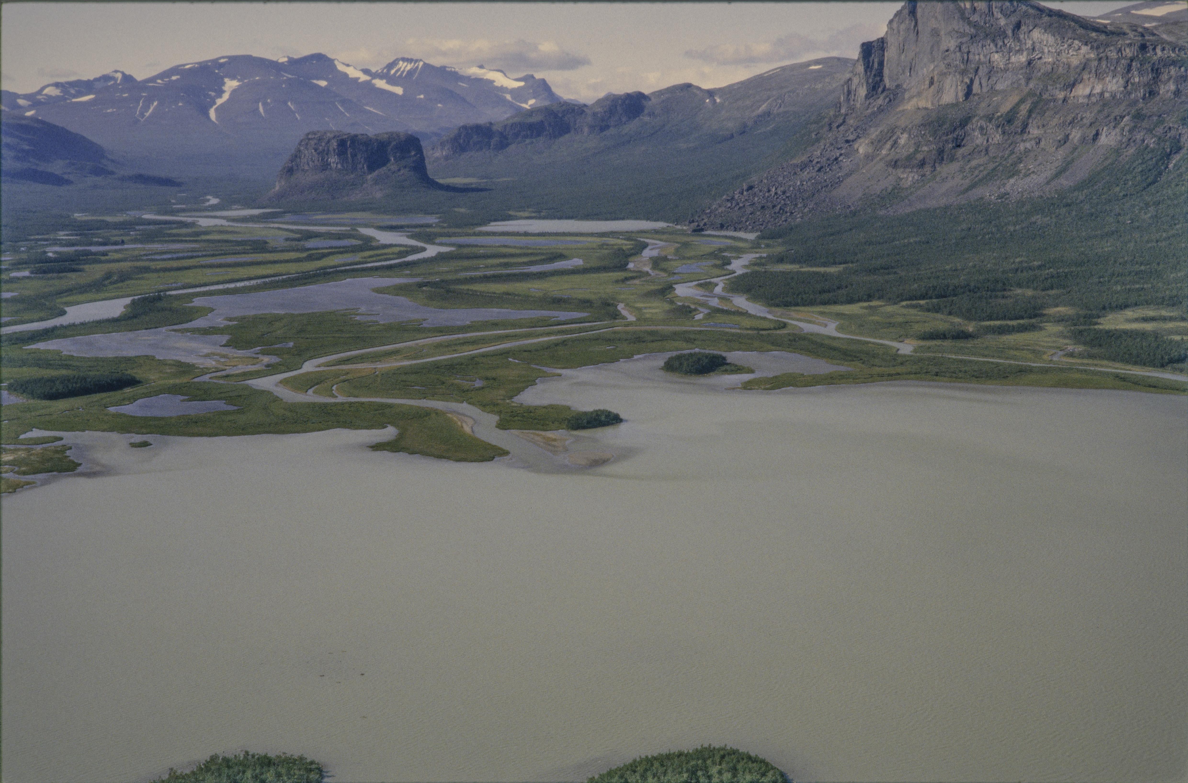 Beskrivning: Sjön Laitaure (Lájtávrre / Lajtjaure), västra delen. Över bildens mitt Rapadeltat vid Rapadalen (Ráhpavuobme). I deltat offerplats RAÄnr Jokkmokk 52:1. Ultevis fjällurskogs naturreservat. Bilden är tagen mot (väderstreck): NV