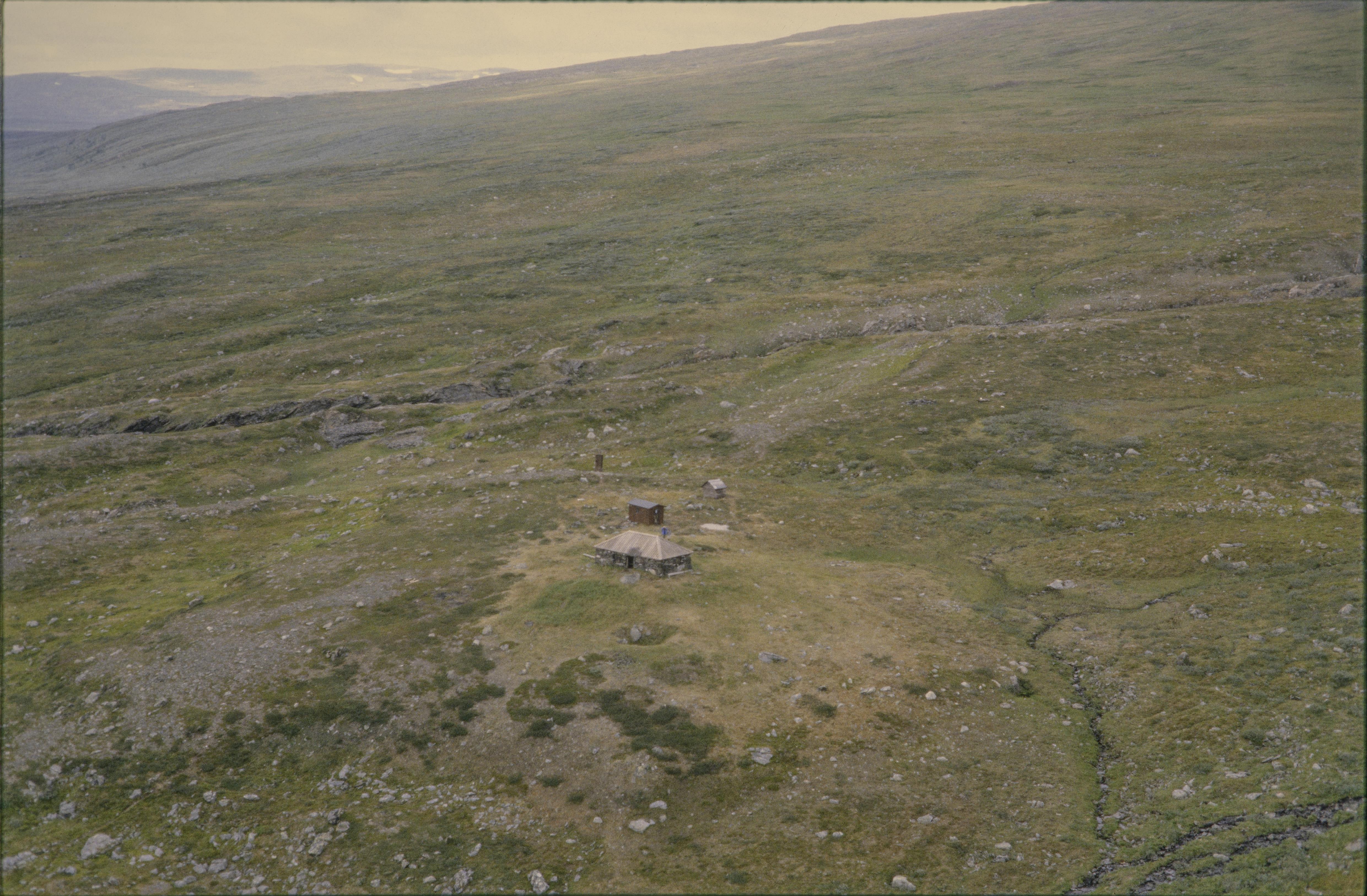 Beskrivning: Fjällområdet och gruvområdet Alkavare (Álggavárre). Alkavare kapell under bildens mitt. Vid kapellet gruvområde RAÄnr Jokkmokk 1296:1. Området ingår i Sareks nationalpark och världsarvet Laponia. Bilden är tagen mot (väderstreck): NV