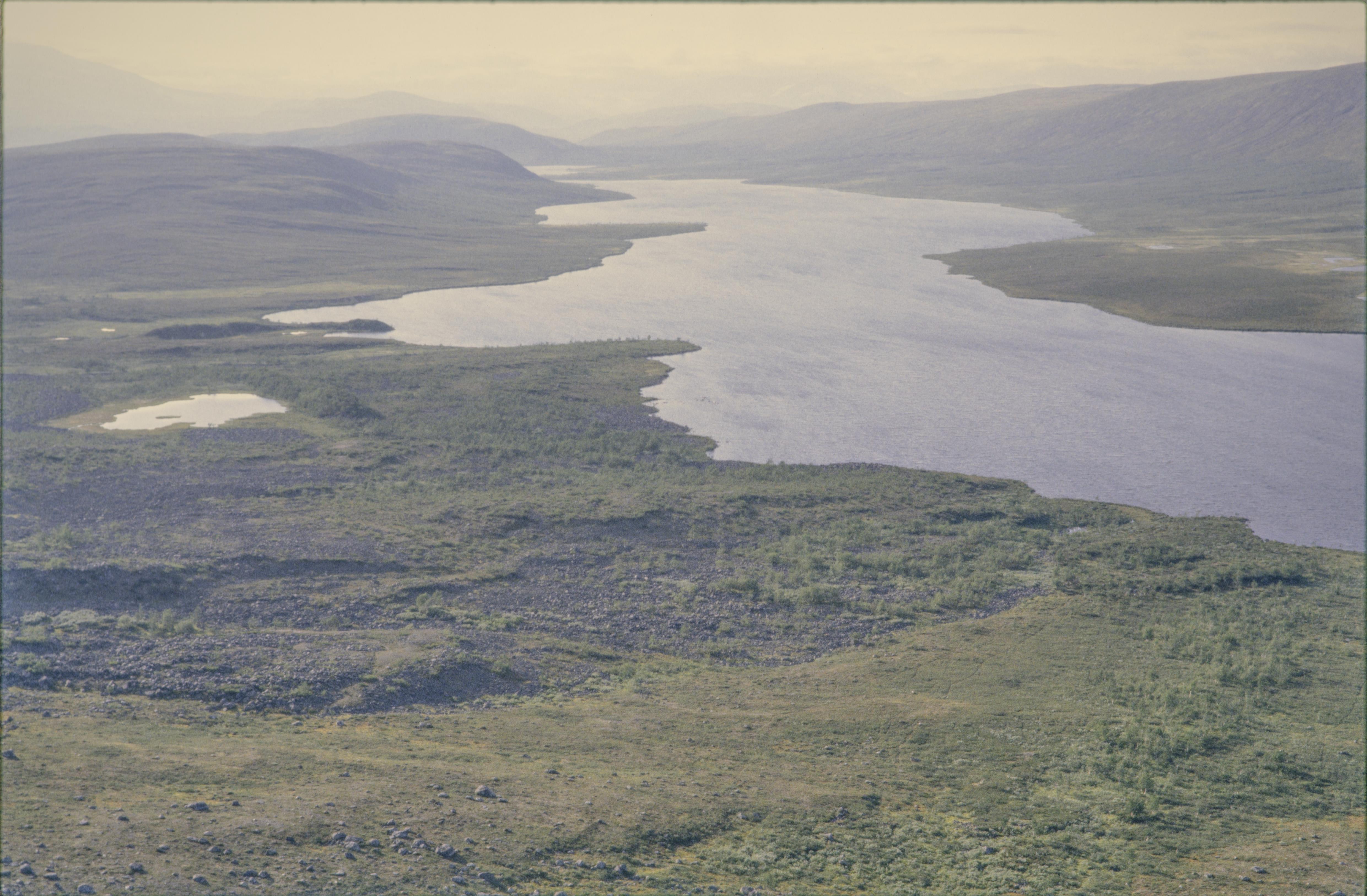 Beskrivning: Sjön Kiepanjaure (Giehpanjávri / Kiehpanjärvi). I bildens nedre del södra stranden i området under berget Giehpanvárri. Till vänster om bildens mitt sjön Darfaljaure (Darfáljávri) och till vänster i bildens övre del berget Darfál i nordvästra ändan av sjön. Bilden är tagen mot (väderstreck): NV