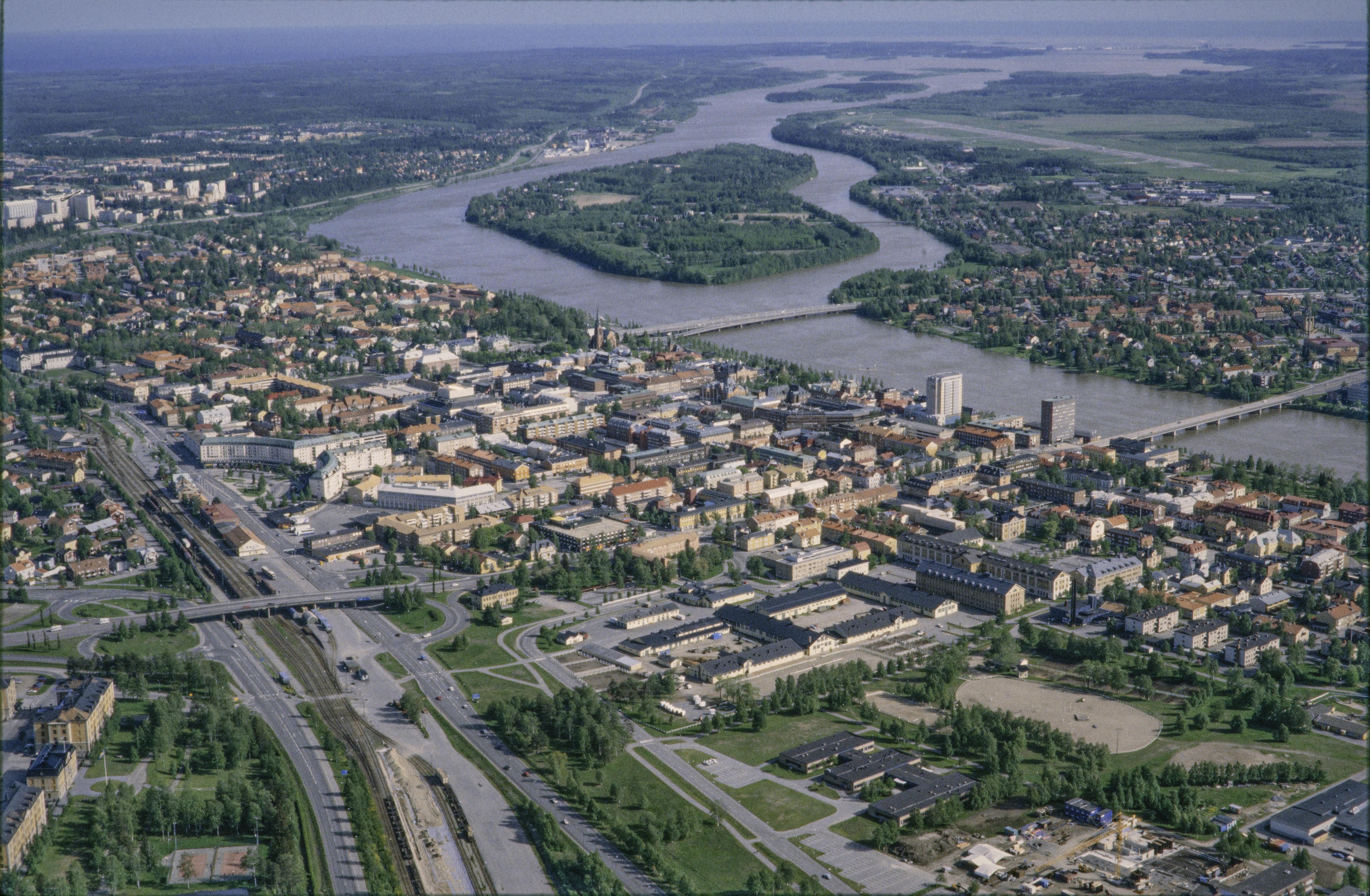 Beskrivning: Umeälven i Umeå stad. Vid bildens mitt Umeå Stads kyrka i Umeå stads centrum / stadslager RAÄnr Umeå stad 128:1. I bildens övre del Ön och Umeälvens deltas naturreservat mot sundet Kvarken. Uppe till höger Umeå flygplats. Bilden är tagen mot (väderstreck): SSO