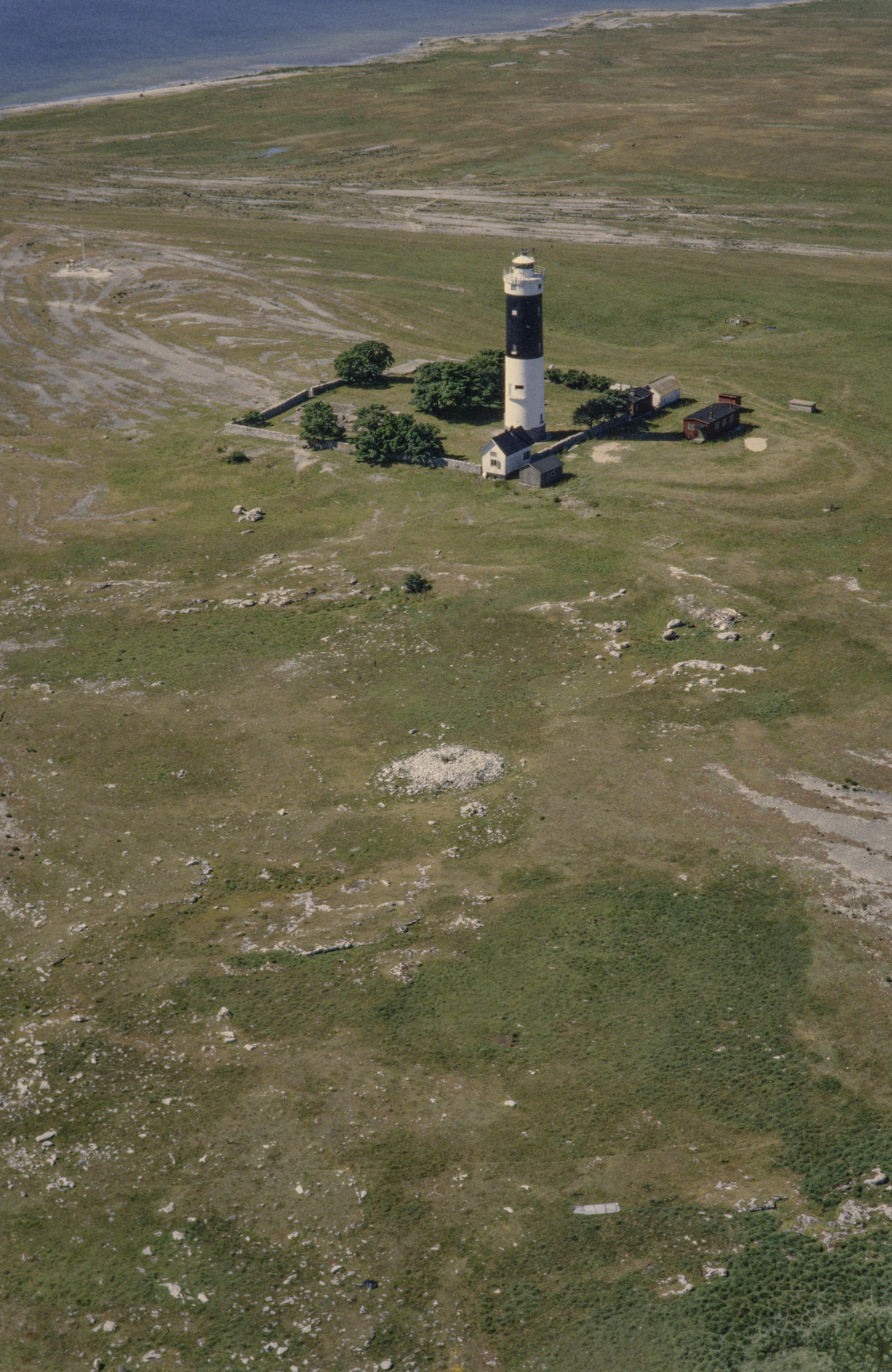 Beskrivning: Ön Östergarnsholm. På ön finns fyra fyrar, två är gamla och inte i bruk. Över bildens mitt Östergarns nya fyr (de andra tre syns inte i bilden). Vid fyren röse och stensättningar RAÄnr Östergarn 21:1 och 104:1 m.fl. Bilden är tagen mot (väderstreck): SSV