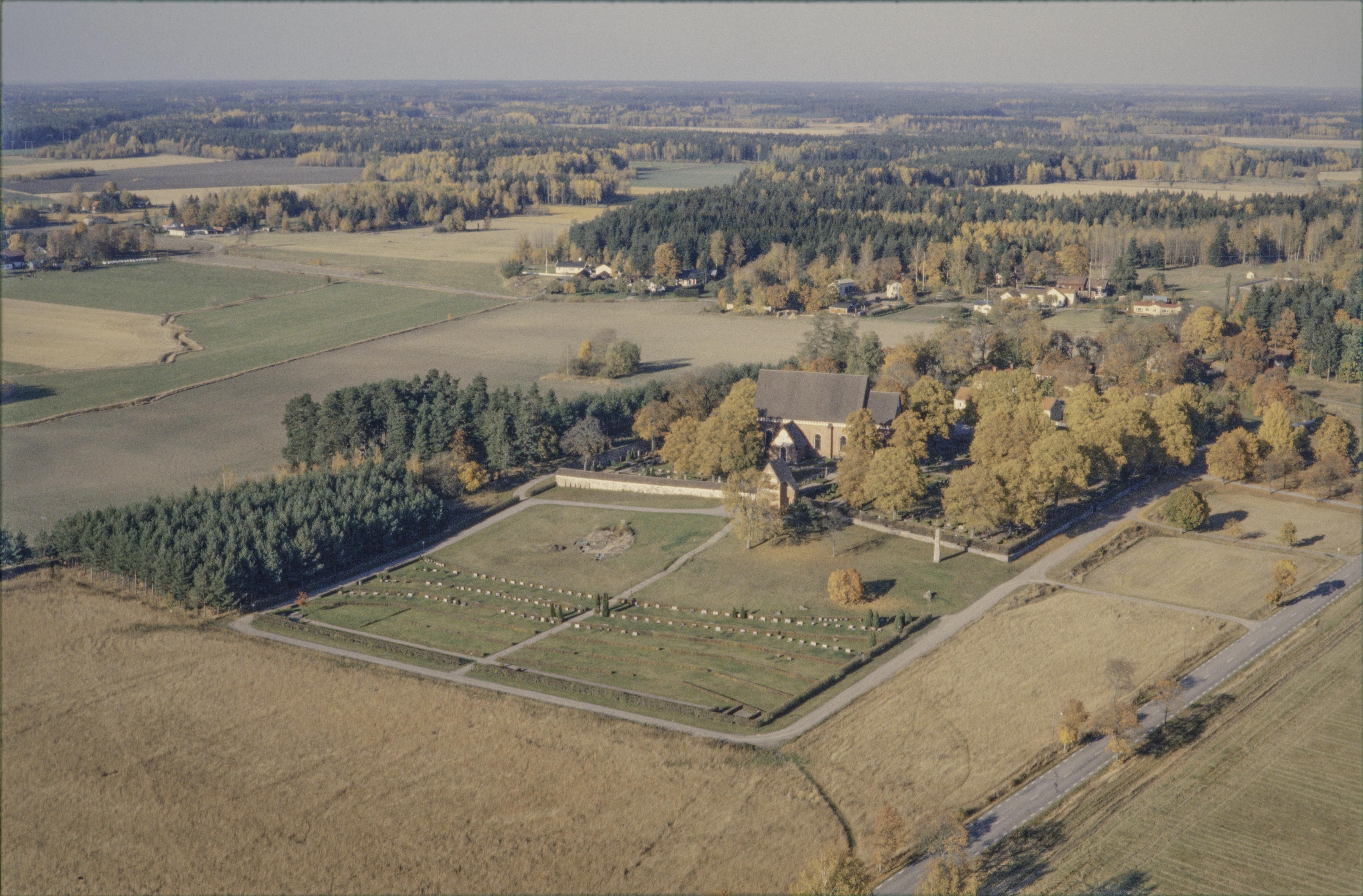 Beskrivning: Vid bildens mitt Vendels kyrka och prästgård. Under bildens mitt minnesmärke och båtgravfält RAÄnr Vendel 9:1-2. Holvarbo by m.fl. i bildens övre del. Bilden är tagen mot (väderstreck): N