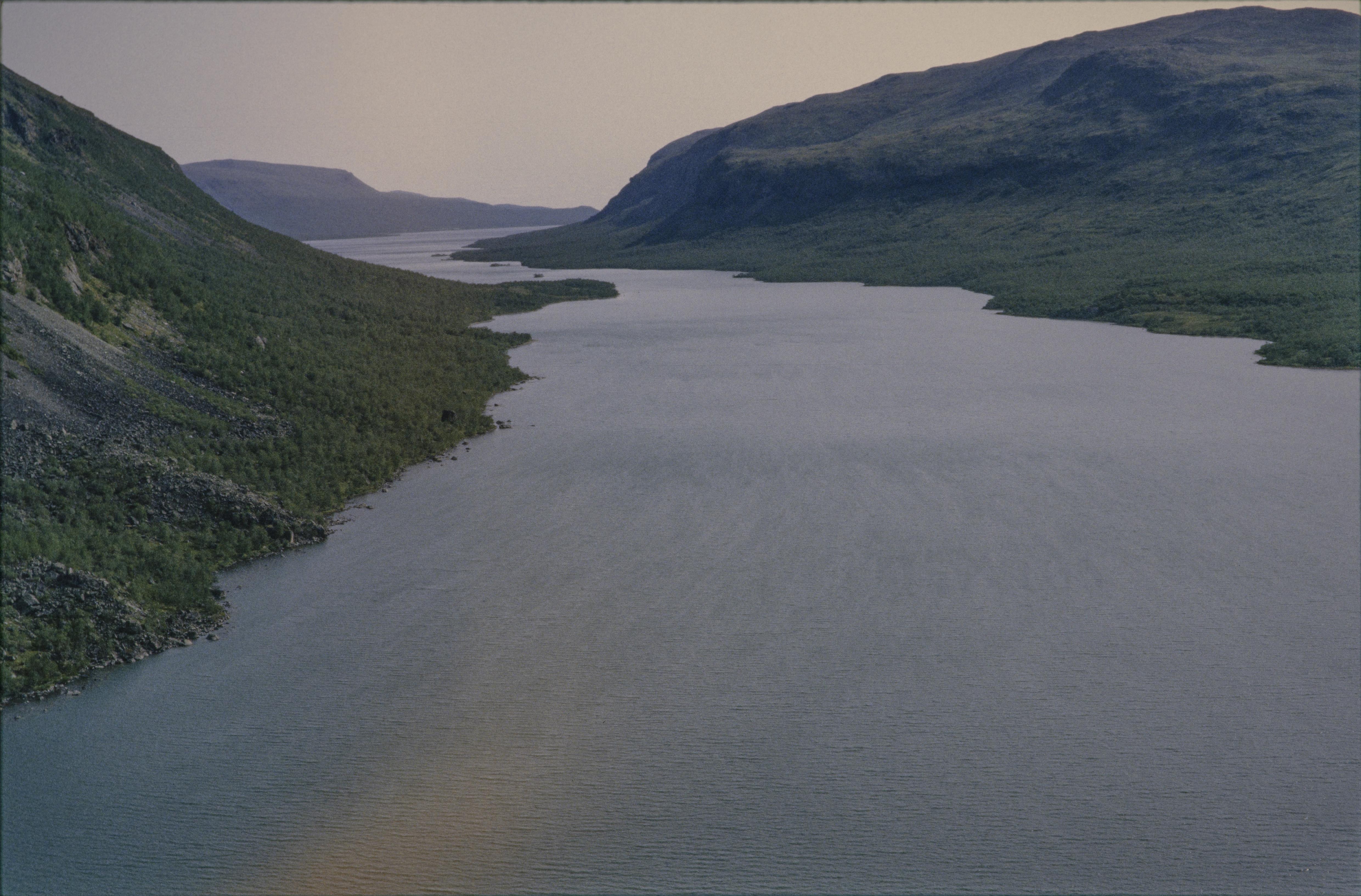 Beskrivning: Sjön Rautasjaure (Rávttasjávri) mot sydöst. I bildens övre del sundet Coalbmi och vid stranden uppe till höger viste RAÄnr Jukkasjärvi 177:1 vid bergen Várregaska och Lulip Vealevárri. Bilden är tagen mot (väderstreck): SO