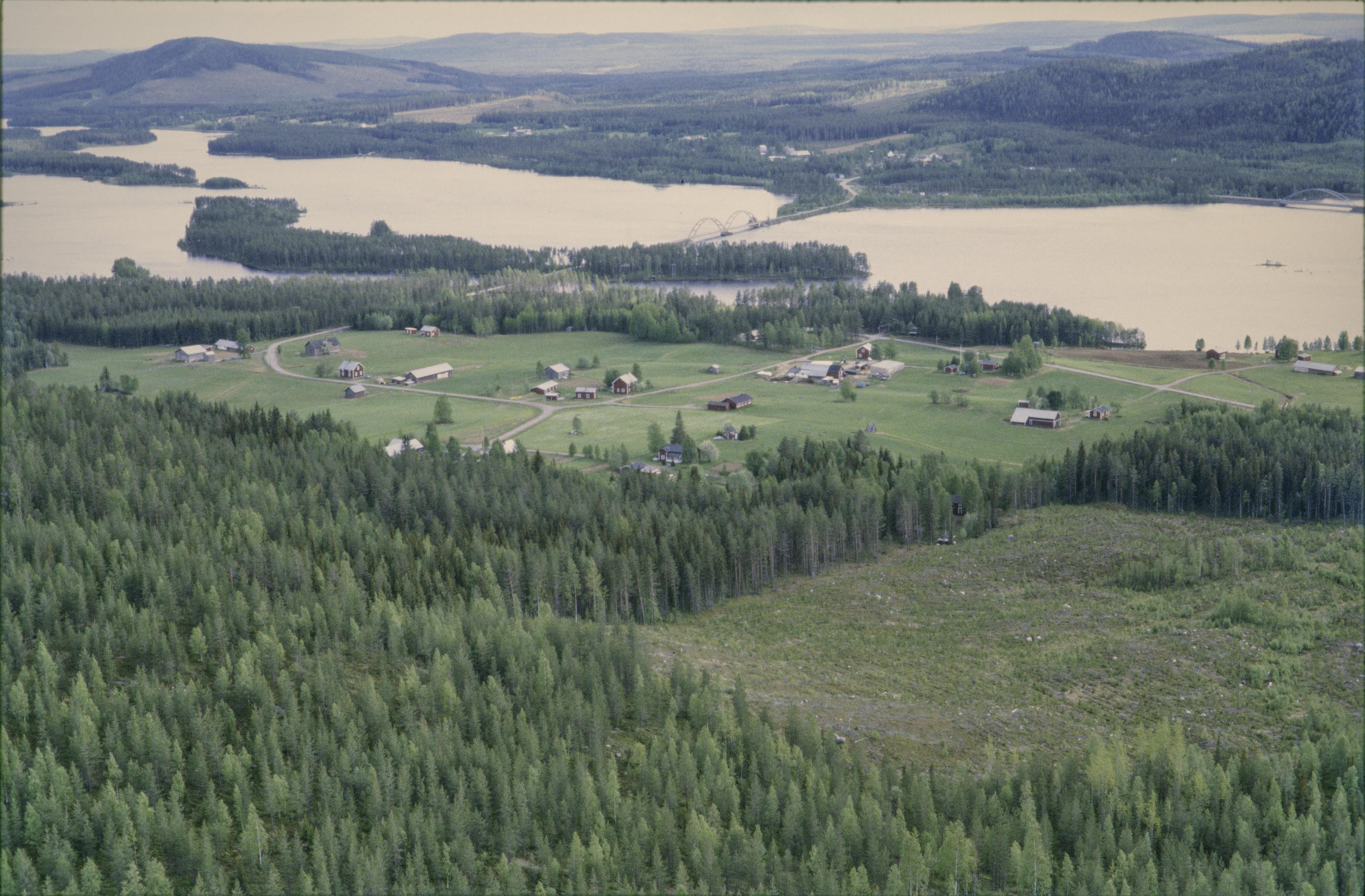 Beskrivning: Åskiljeby (Geäddiedievvá) vid sjön Åskilje (Jeanoejåakoe) där Umeälven sammanflöder med Juktån. Vid bildens mitt boplats RAÄnr Stensele 50:1 m.fl. Åskilje kyrka skymtar mellan broarna till höger i bildens övre del. Bilden är tagen mot (väderstreck): S