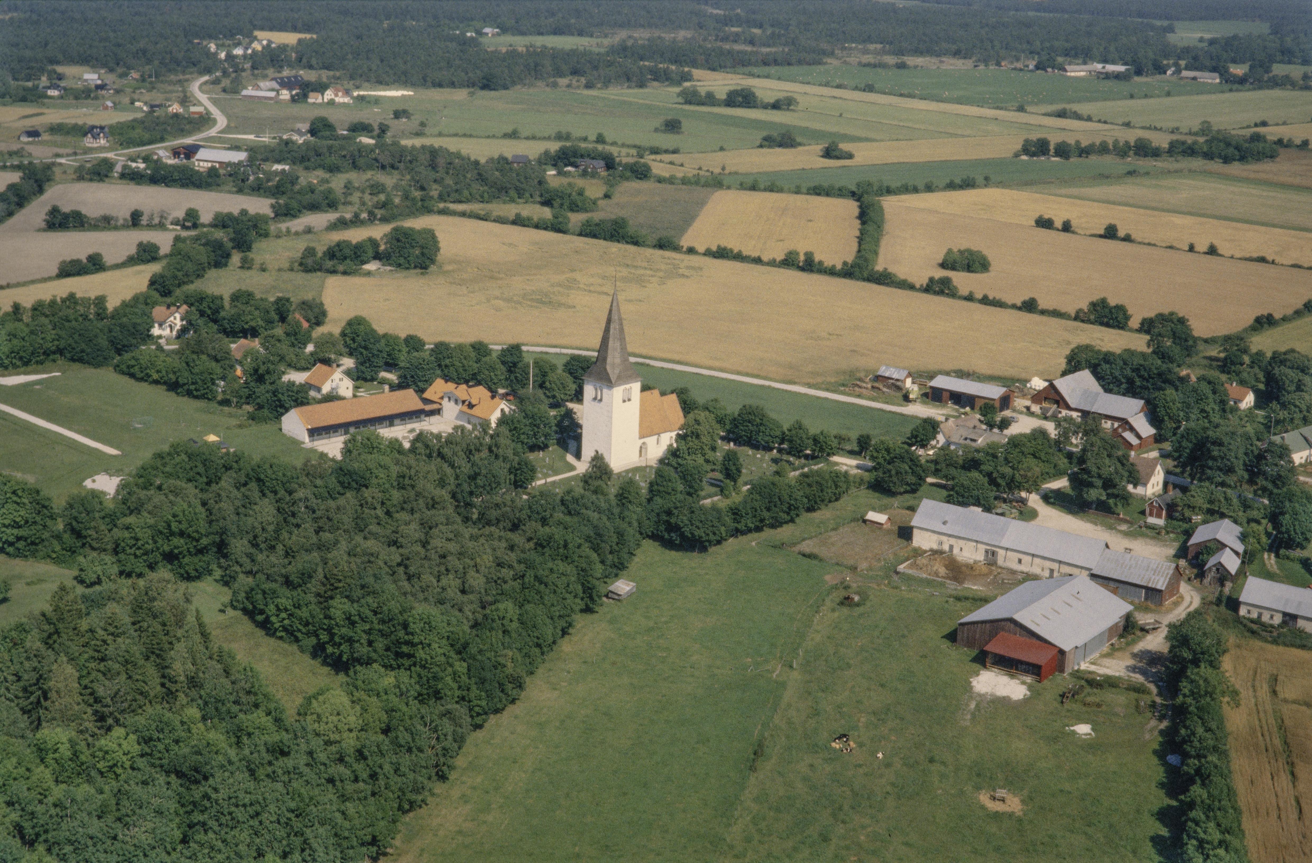 Beskrivning: Hangvars kyrkby. Hangvars kyrka i bildens mitt. I kyrkan bildsten med runinskrift RAÄnr Hangvar 122:1. Bilden är tagen mot (väderstreck): NO