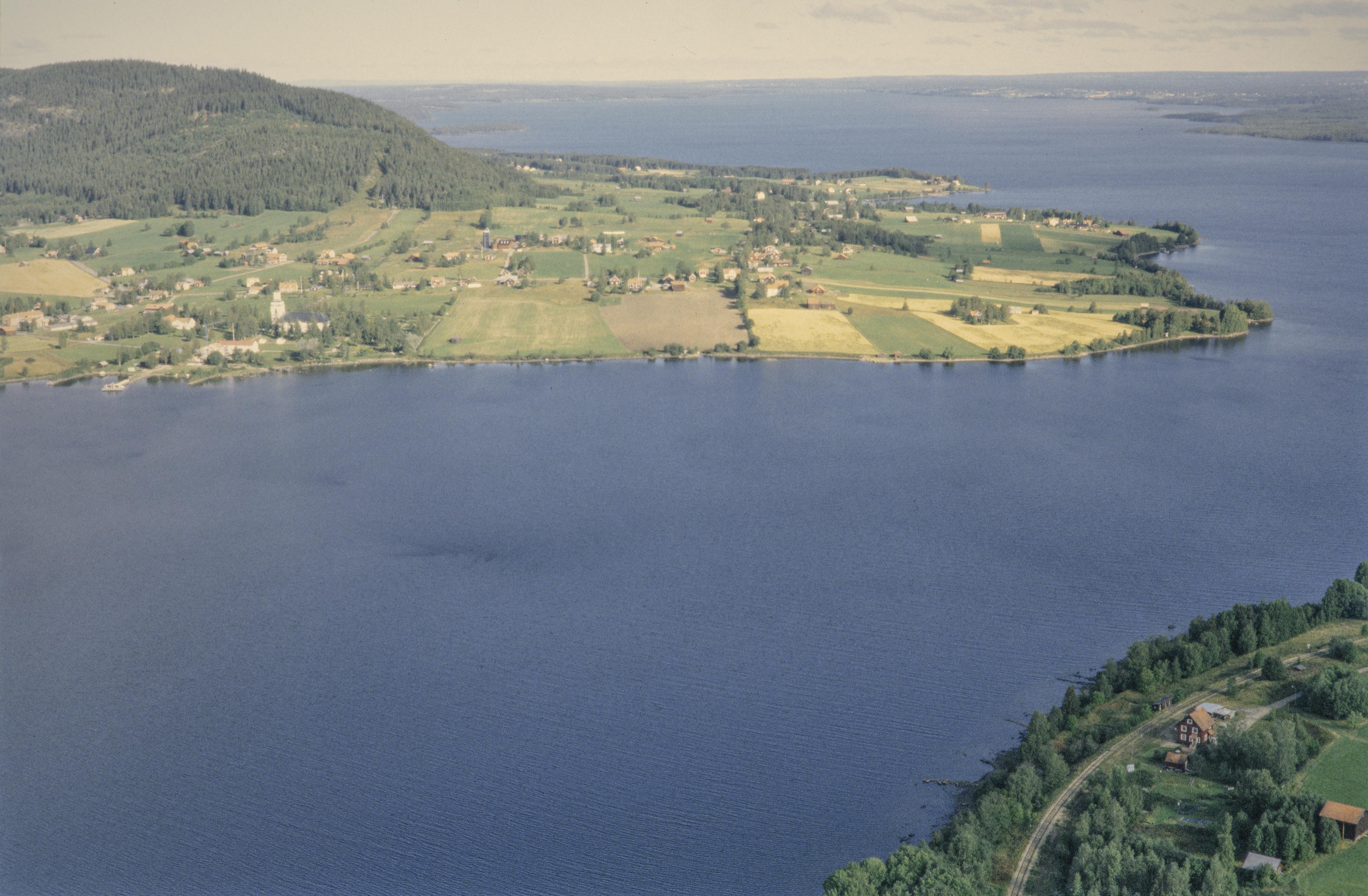 Beskrivning: Bergsviken i Storsjön. Skanderåsen i bildens nedre del. Längs stranden till höger under bildens mitt färdväg RAÄnr Berg 351. I bildens övre del Bergs kyrkby under Hoverberget. Bergs kyrka till vänster över bildens mitt. Bilden är tagen mot (väderstreck): N