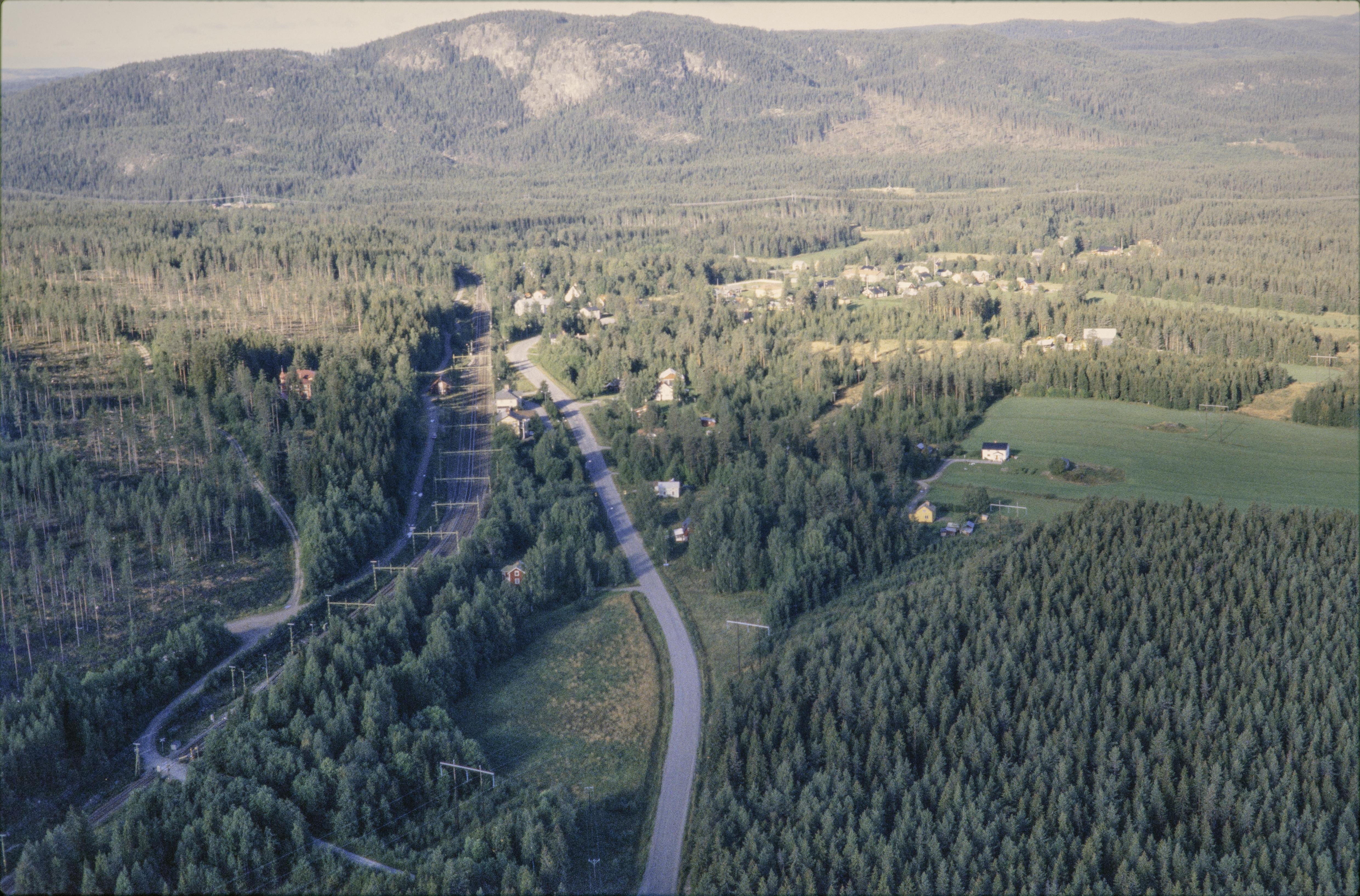 Beskrivning: Ragunda stationssamhälle i Singsåns dalgång. Vid bildens mitt Ragunda järnvägsstation. Fäbod RAÄnr Ragunda 140:1 vid Singsån i skogen uppe till vänster. Bilden är tagen mot (väderstreck): V