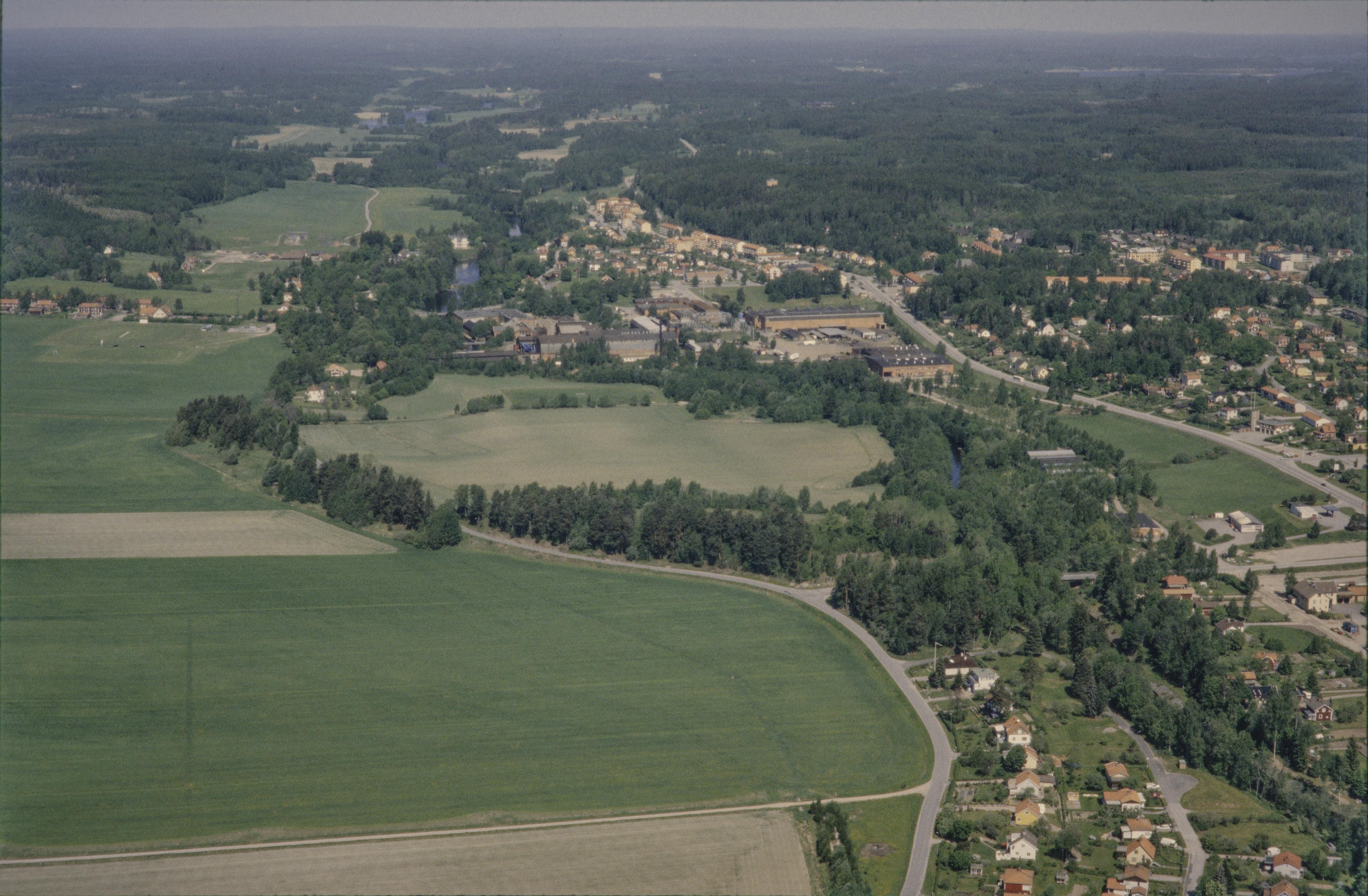 Beskrivning: Hedströmmen vid Kolsva bruk och tätort. Till vänster över bildens mitt Kolsva herrgård (skrivs även Kohlswa herrgård) och till höger Kolsva brukskyrka. I skogen uppe till höger fornborg RAÄnr Kolsva 63:1. Bilden är tagen mot (väderstreck): N