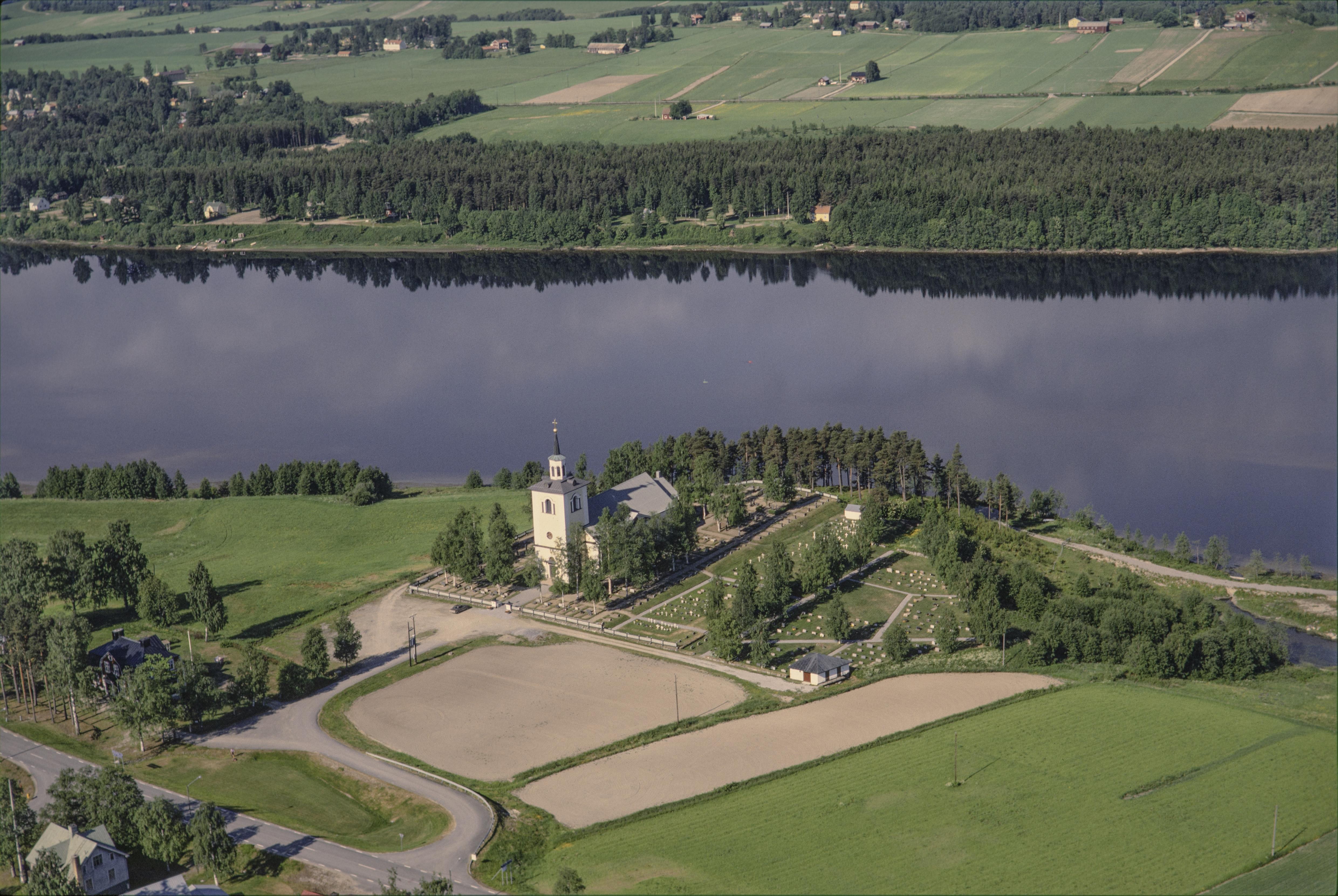 Beskrivning: I bildens nedre del Styrnäs kyrkby vid Ångermanälven. Älven markerar gränsen mot socknet Torsåker. Styrnäs kyrka under bildens mitt. Vid kyrkan gravfält RAÄnr Styrnäs 26:1. Bilden är tagen mot (väderstreck): VSV