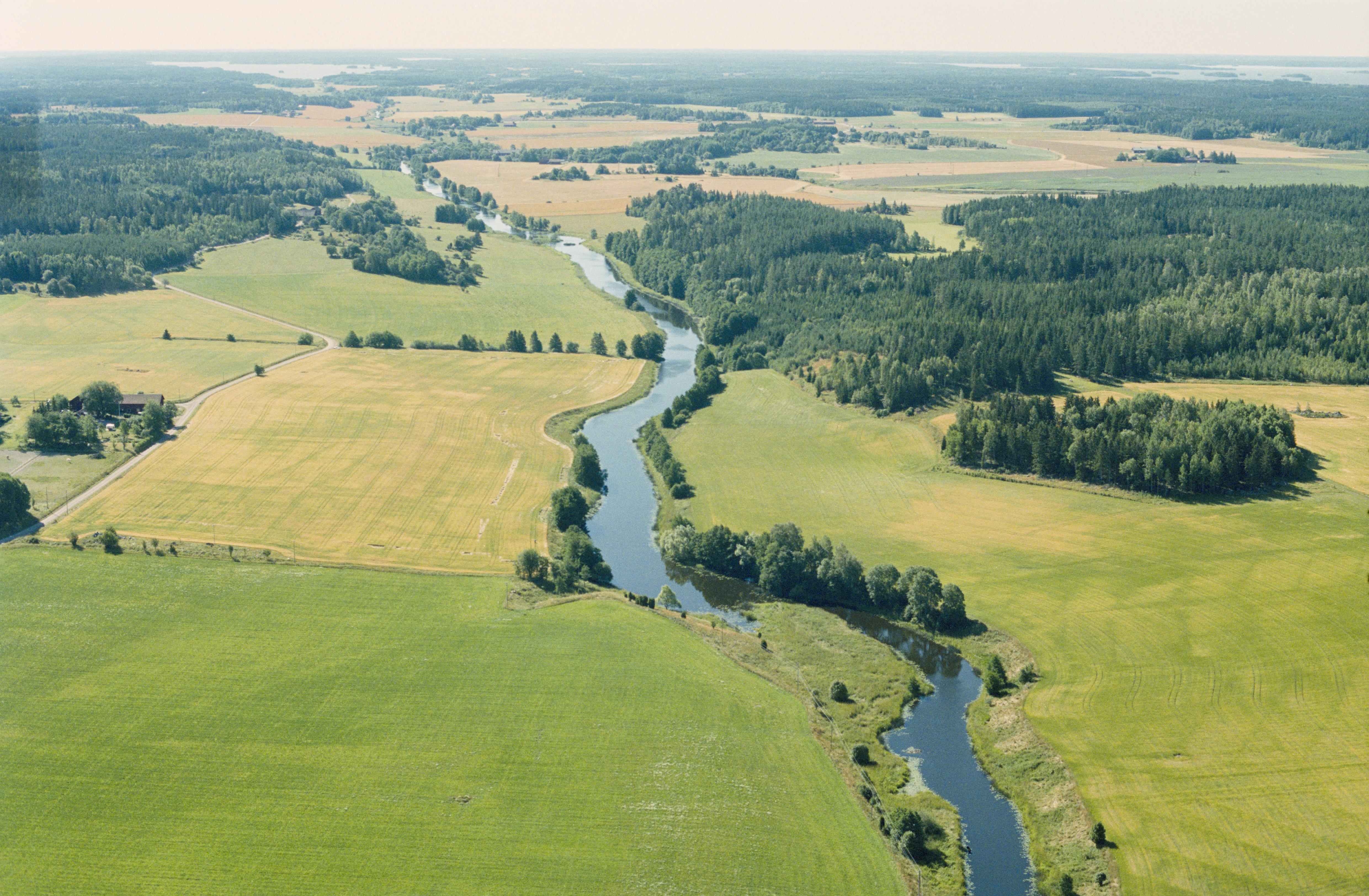 Beskrivning: Sagåns dalgång mot Nykvarn och Östanbro där den möter Lillån (i bildens övre del). Sagån markerar gränsen mellan socknet Tillinge i landskapet Uppland i riksintresset C55 (till vänster) och socknet Björksta i landskapet Västmanland (till höger). Till höger om bildens mitt gravfält RAÄnr Björksta 18:1 vid Västra Skarsvad. Mälaren i bildens övre kant. Bilden är tagen mot (väderstreck): S