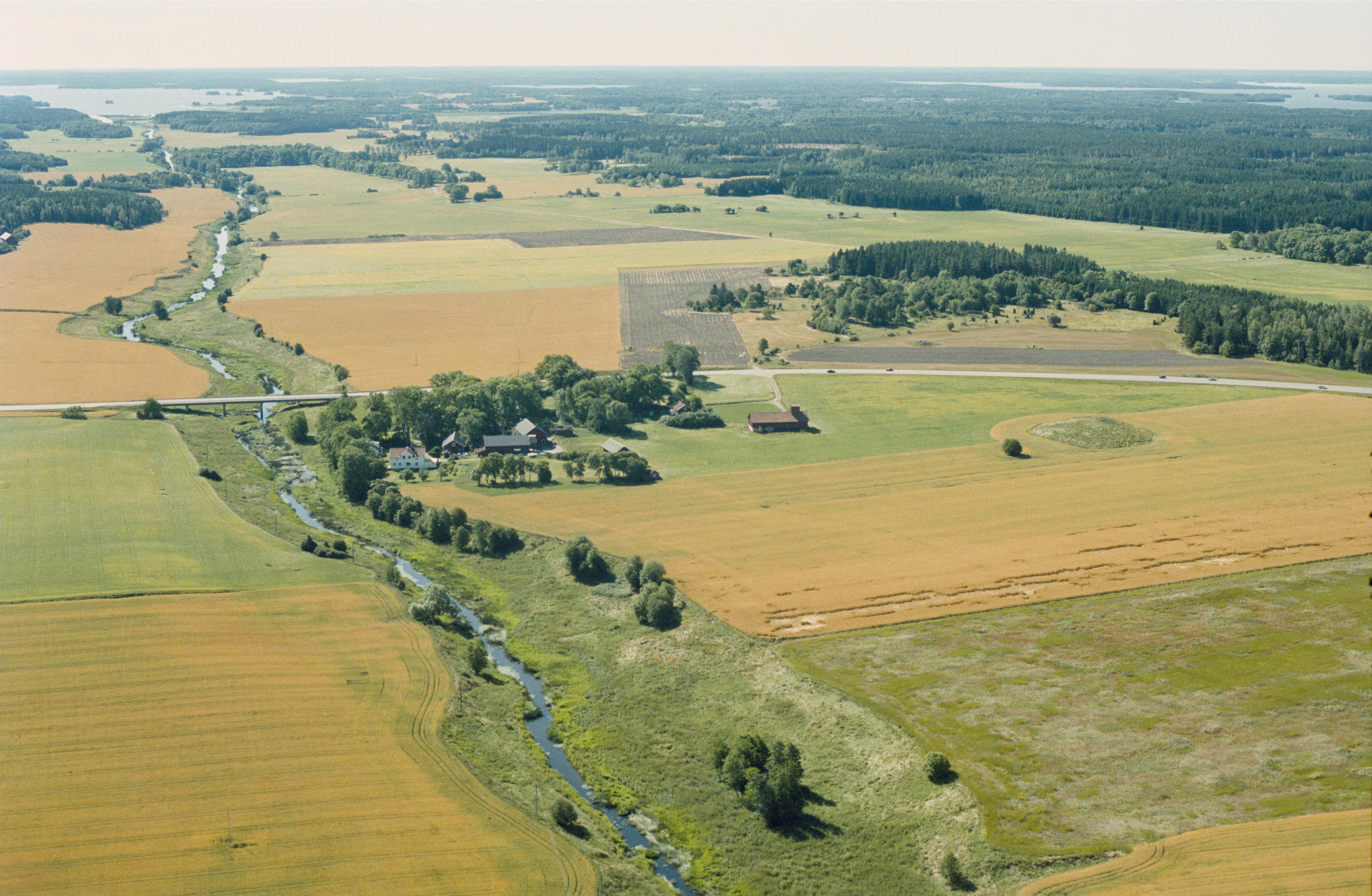 Beskrivning: Sagån markerar gränsen mellan Tillinge socken i landskapet Uppland i riksintresset C55 (till vänster) och Björksta socken i landskapet Västmanland i riksintresset U28 (till höger). Till höger om bildens mitt Kung Östens hög RAÄnr Björksta 106:1 vid Östanbro. Mälaren i bildens övre kant. Bilden är tagen mot (väderstreck): S