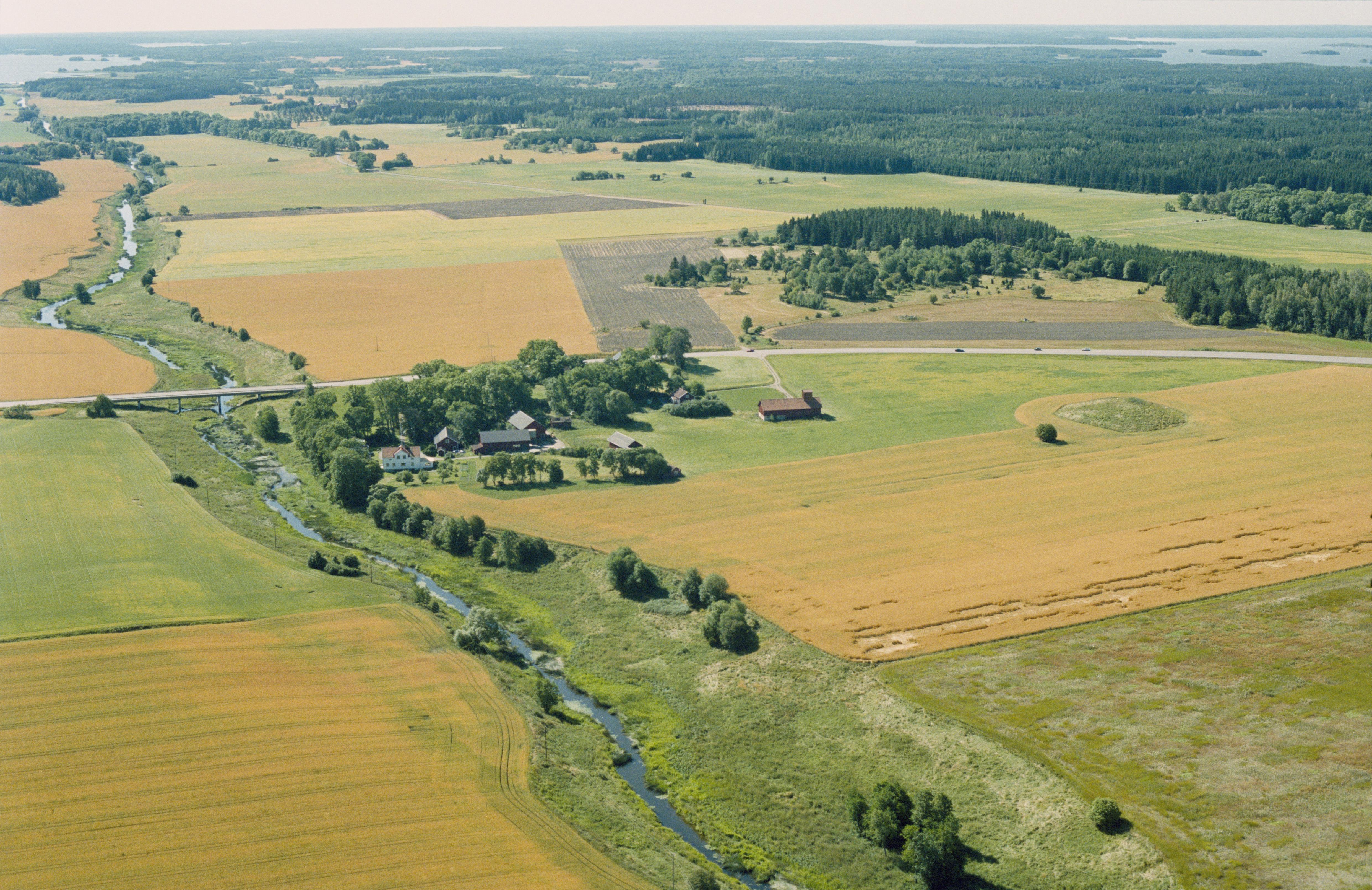 Beskrivning: Sagån markerar gränsen mellan Tillinge socken i landskapet Uppland i riksintresset C55 (till vänster) och Björksta socken i landskapet Västmanland i riksintresset U28 (till höger). Till höger om bildens mitt Kung Östens hög RAÄnr Björksta 106:1 vid Östanbro. Mälaren i bildens övre kant. Bilden är tagen mot (väderstreck): S