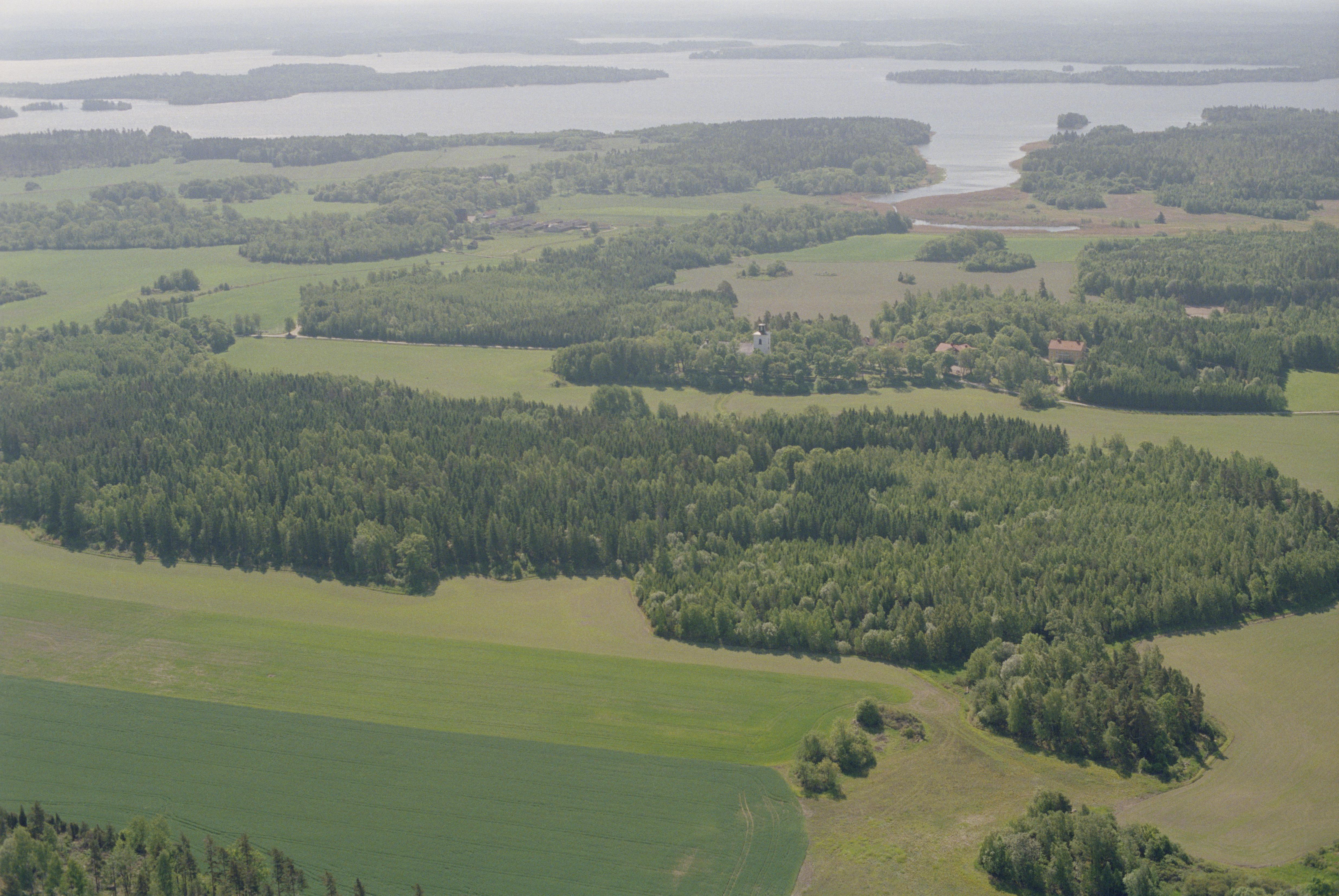 Beskrivning: Rytterne kyrka RAÄnr Rytterne 140:1. I bildens övre del herrgården Fiholm vid fjärden Lilla Blacken i Mälaren. Bilden är tagen mot (väderstreck): SSO