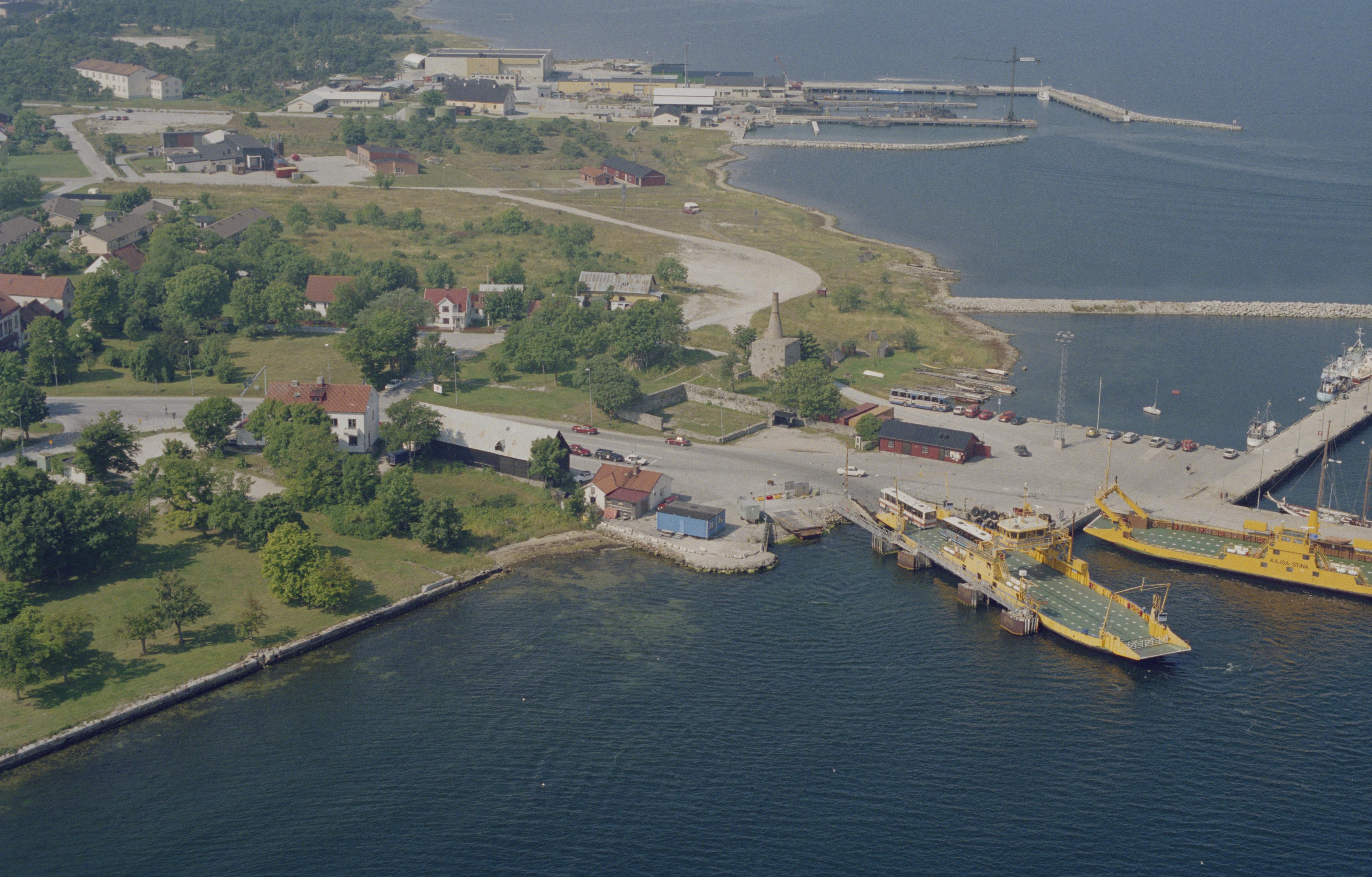 Beskrivning: Hamnen i orten Fårösund. Vid bildens mitt kalkugn RAÄnr Bunge 46:1. Bilden är tagen mot (väderstreck): V