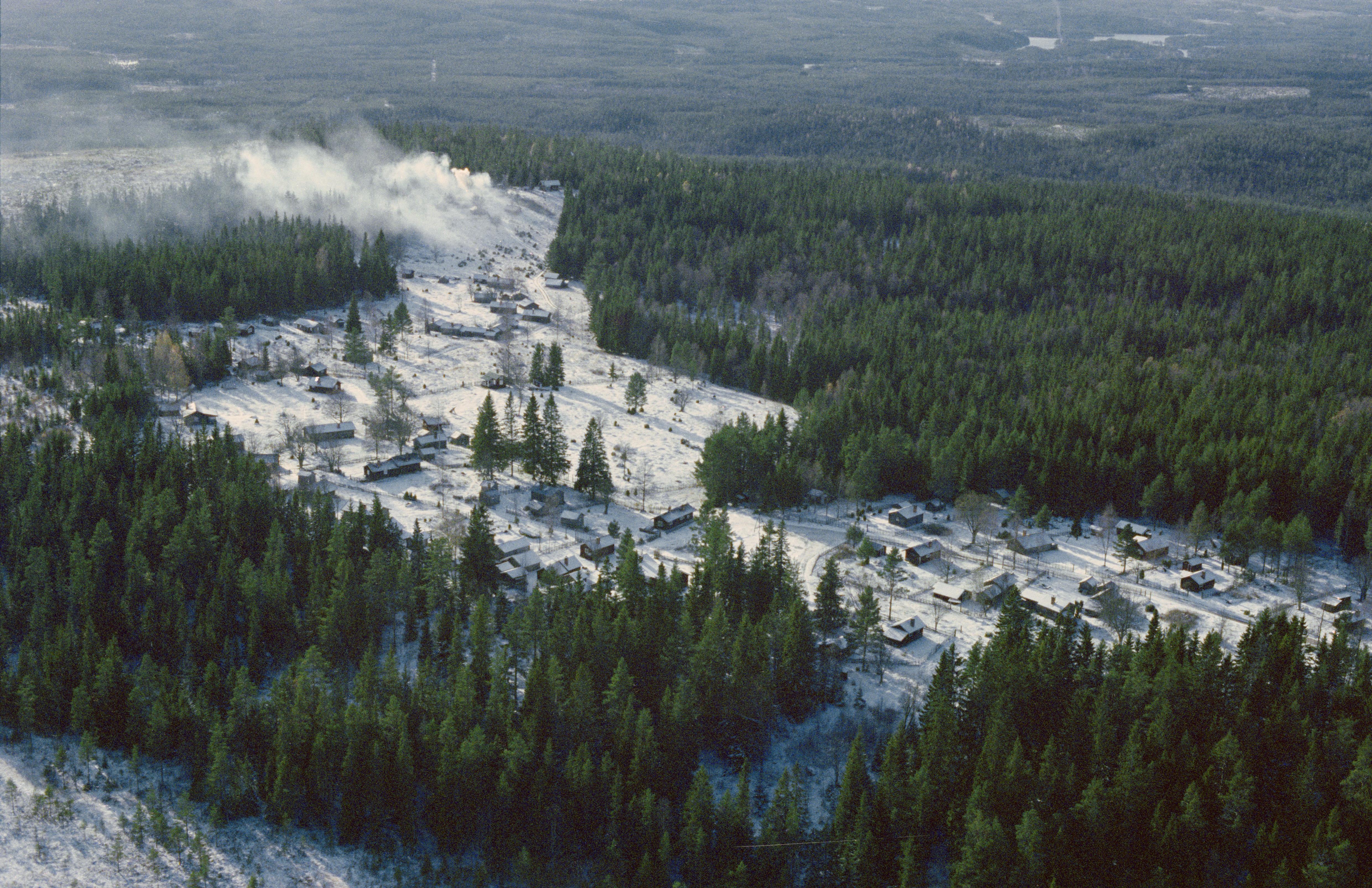 Beskrivning: Bastbergets fäbodmiljö RAÄnr Gagnef 39:1. Över bildens mitt fäbodar med nummer 101, 103, 105, 107 m.fl. i södra delen av byn. Bilden är tagen mot (väderstreck): SV