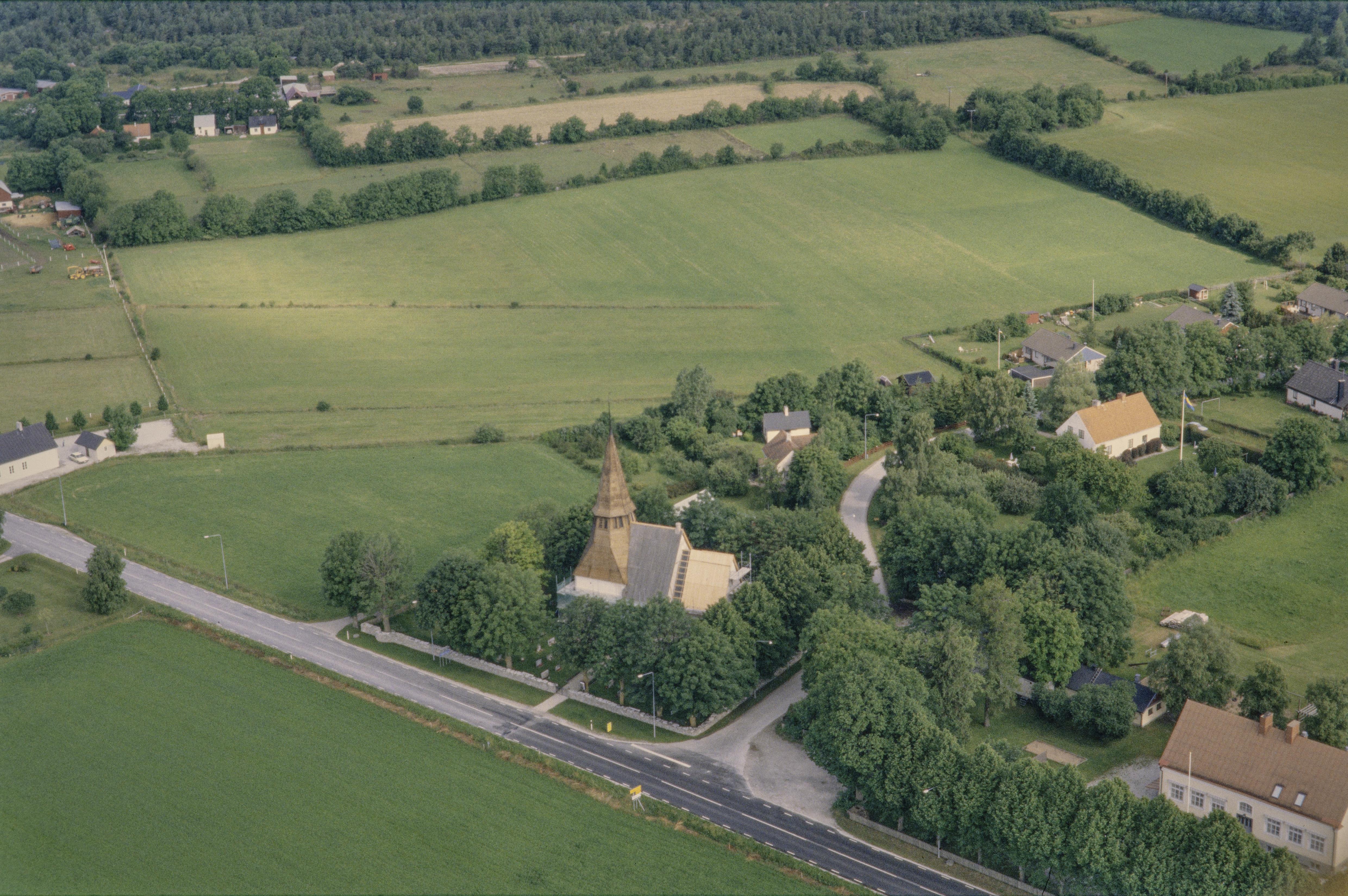 Beskrivning: Träkumla kyrkby. Träkumla kyrka under bildens mitt. Vid kyrkan brunn RAÄnr Träkumla 97. Bilden är tagen mot (väderstreck): NNV
