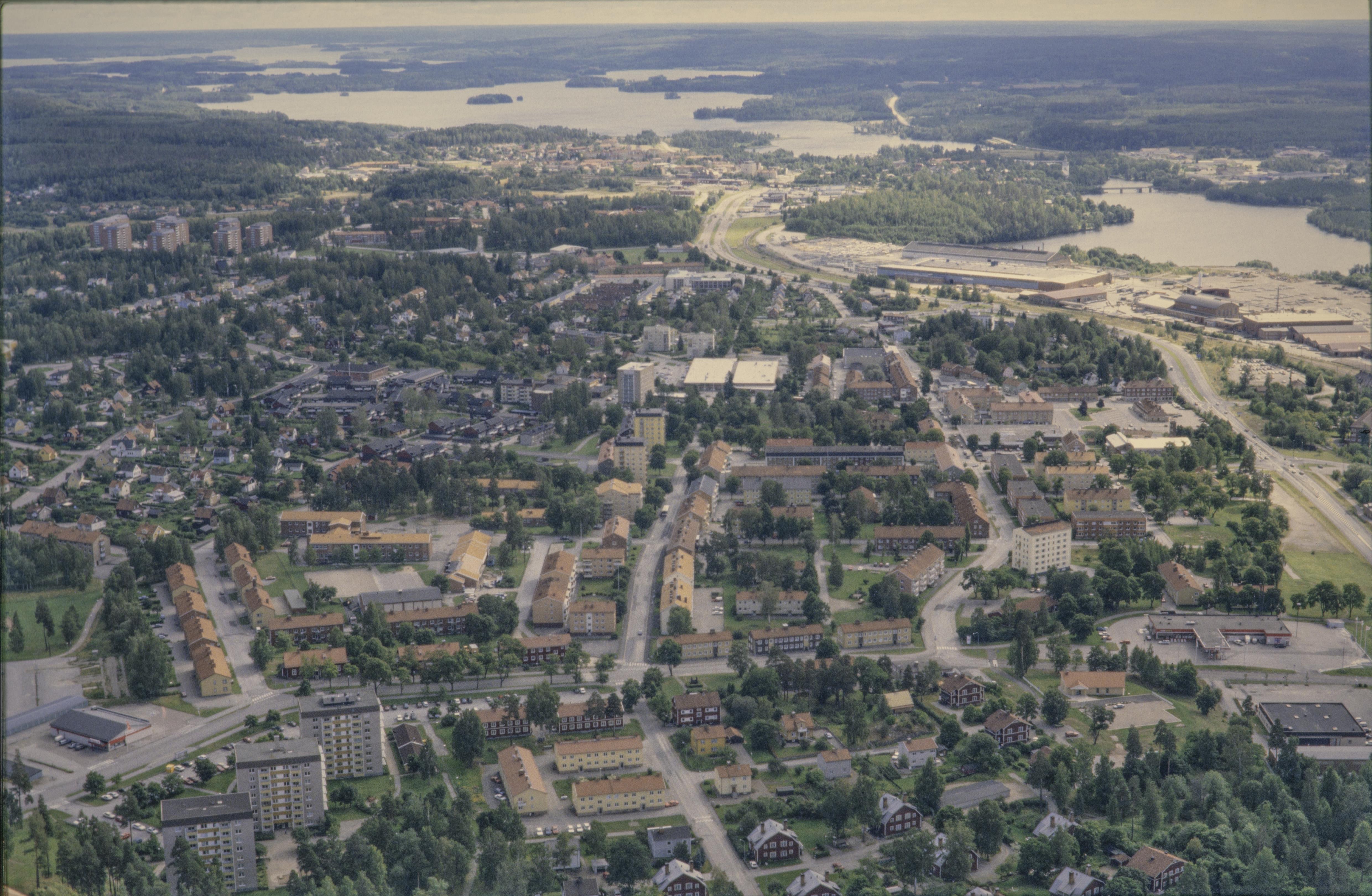 Beskrivning: Fagersta tätort vid bygnadsminnet Strömsholms kanal och sjöarna Kratten och Stora Aspen. Bilden är tagen mot (väderstreck): SO