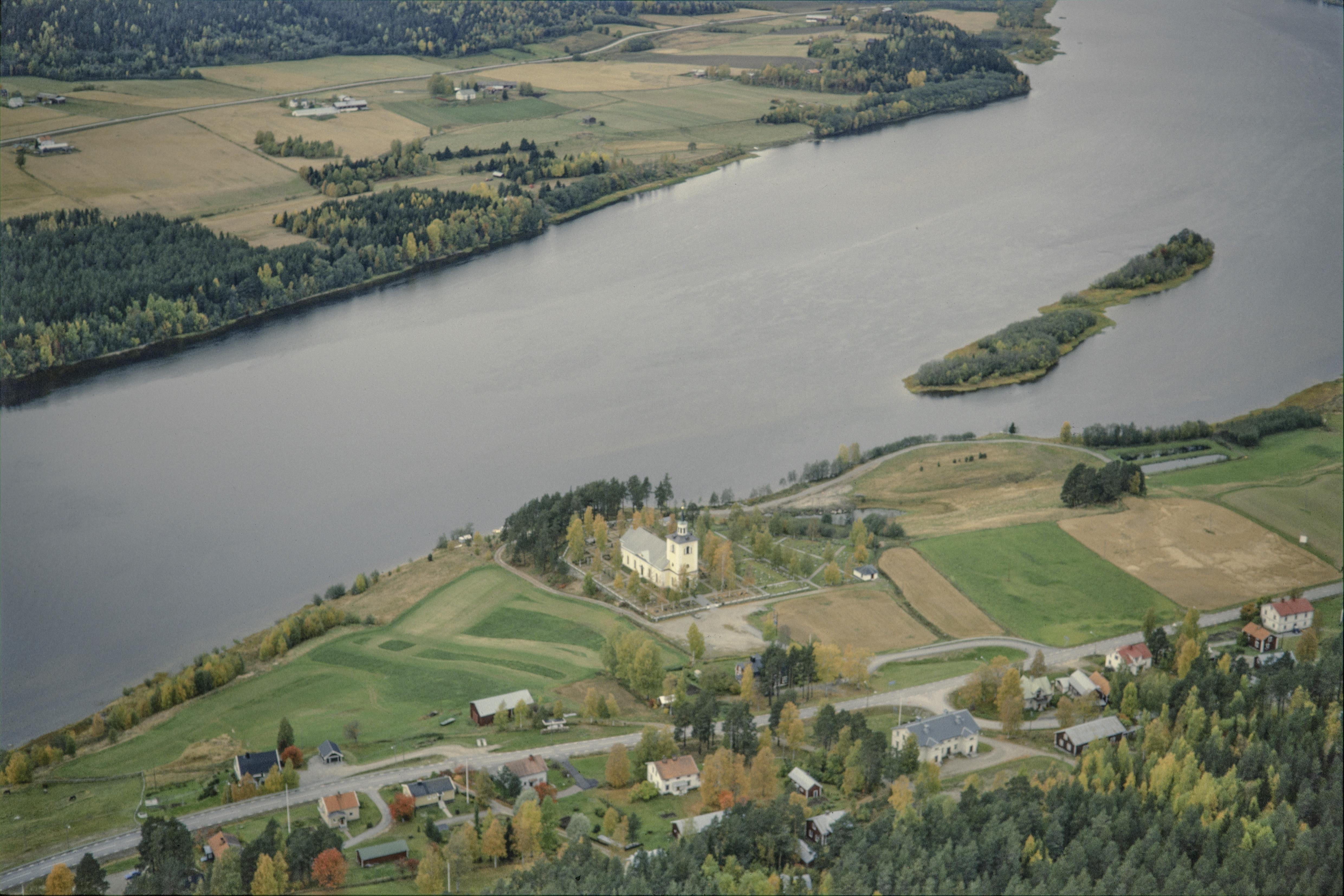 Beskrivning: I bildens nedre del Styrnäs kyrkby vid Ångermanälven. Älven markerar gränsen mot socknet Torsåker. Styrnäs kyrka under bildens mitt. Vid kyrkan gravfält RAÄnr Styrnäs 26:1. Bilden är tagen mot (väderstreck): NV