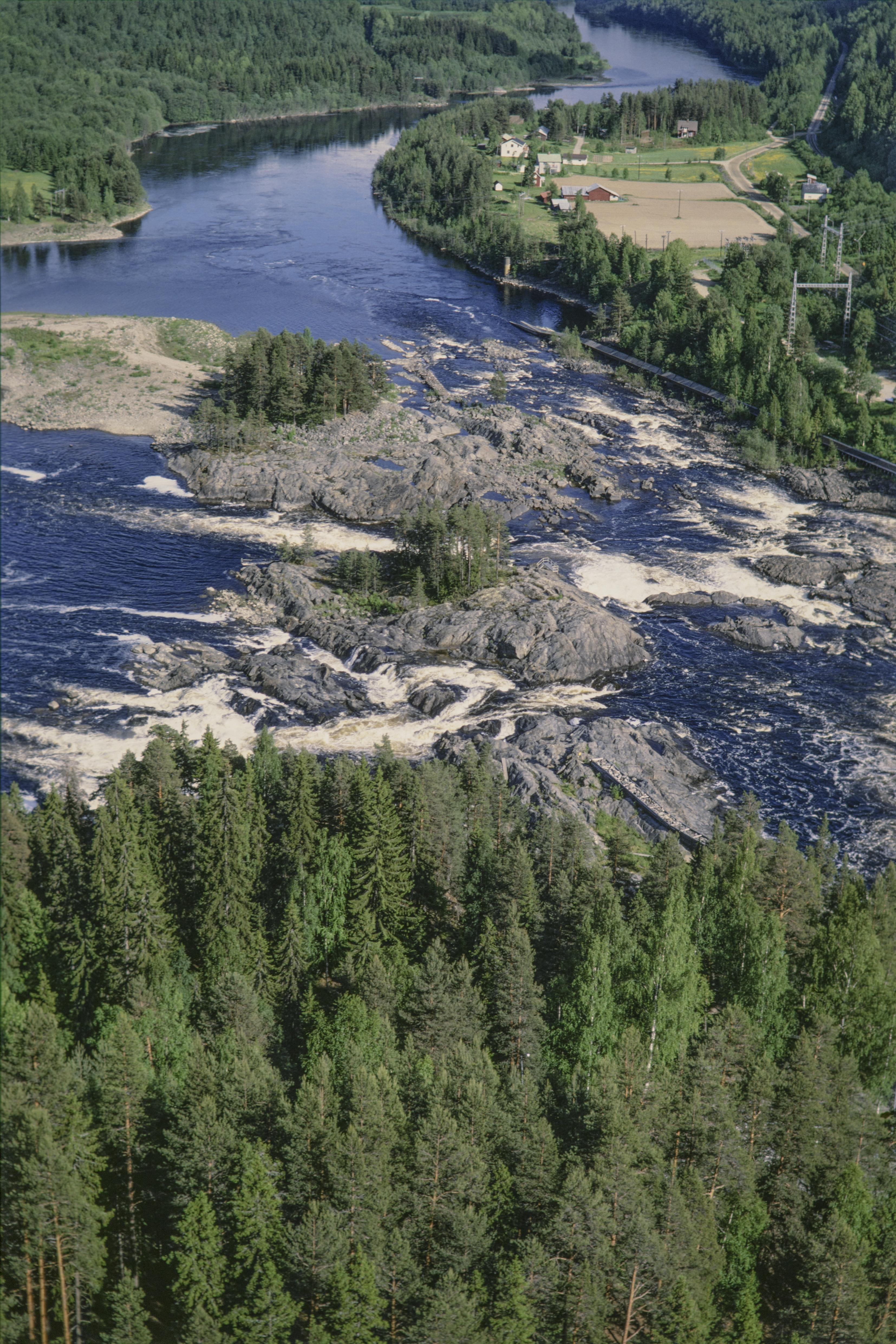 Beskrivning: Nämforsen i Ångermanälvens dalgång. I bildens mitt ett stort hällristningskomplex på Laxön, Brådön och Notön, RAÄnr Ådals-Liden 193:1. Bilden är tagen mot (väderstreck): SO