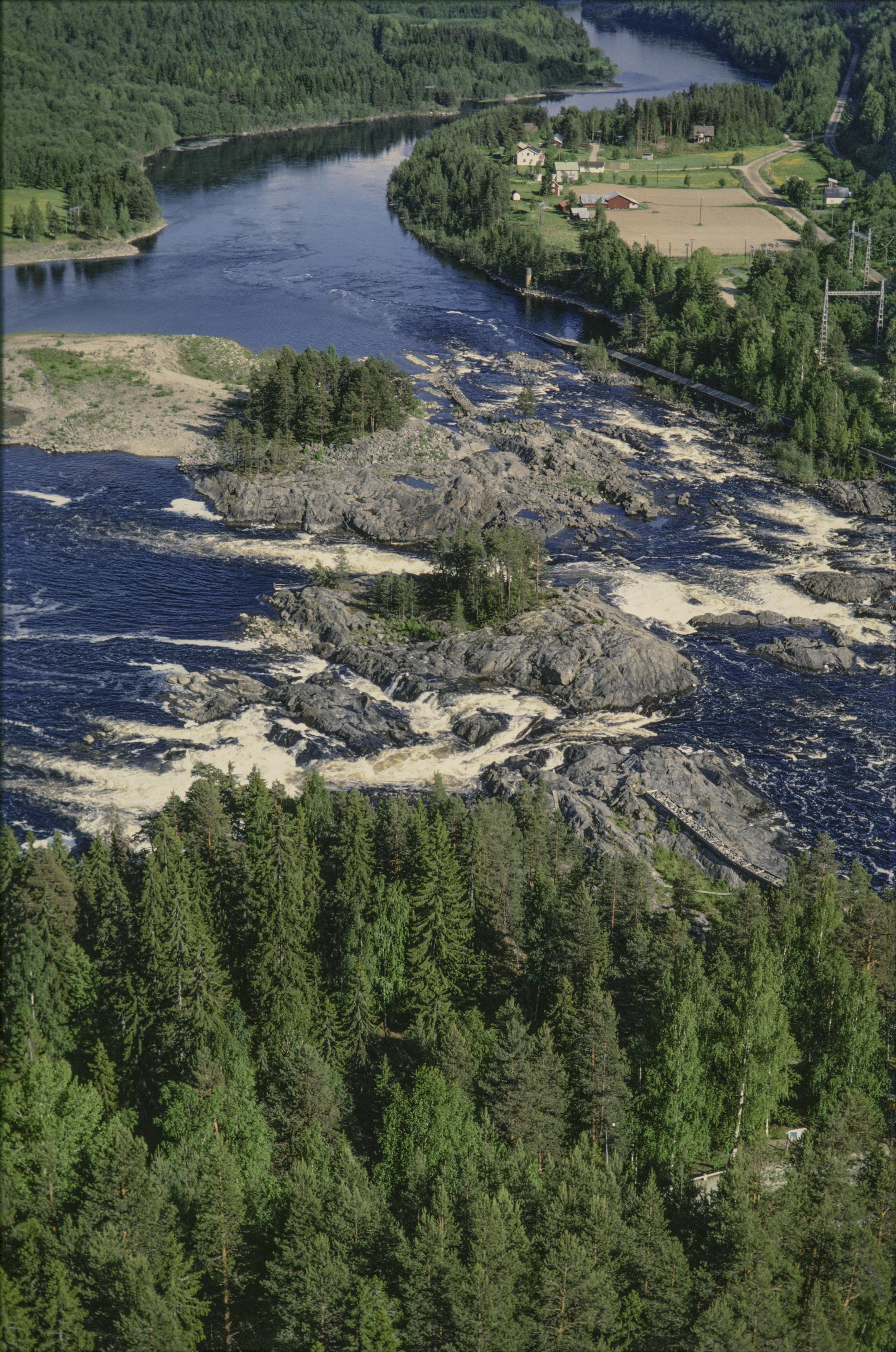 Beskrivning: Nämforsen i Ångermanälvens dalgång. I bildens mitt ett stort hällristningskomplex på Laxön, Brådön och Notön, RAÄnr Ådals-Liden 193:1. Bilden är tagen mot (väderstreck): SO