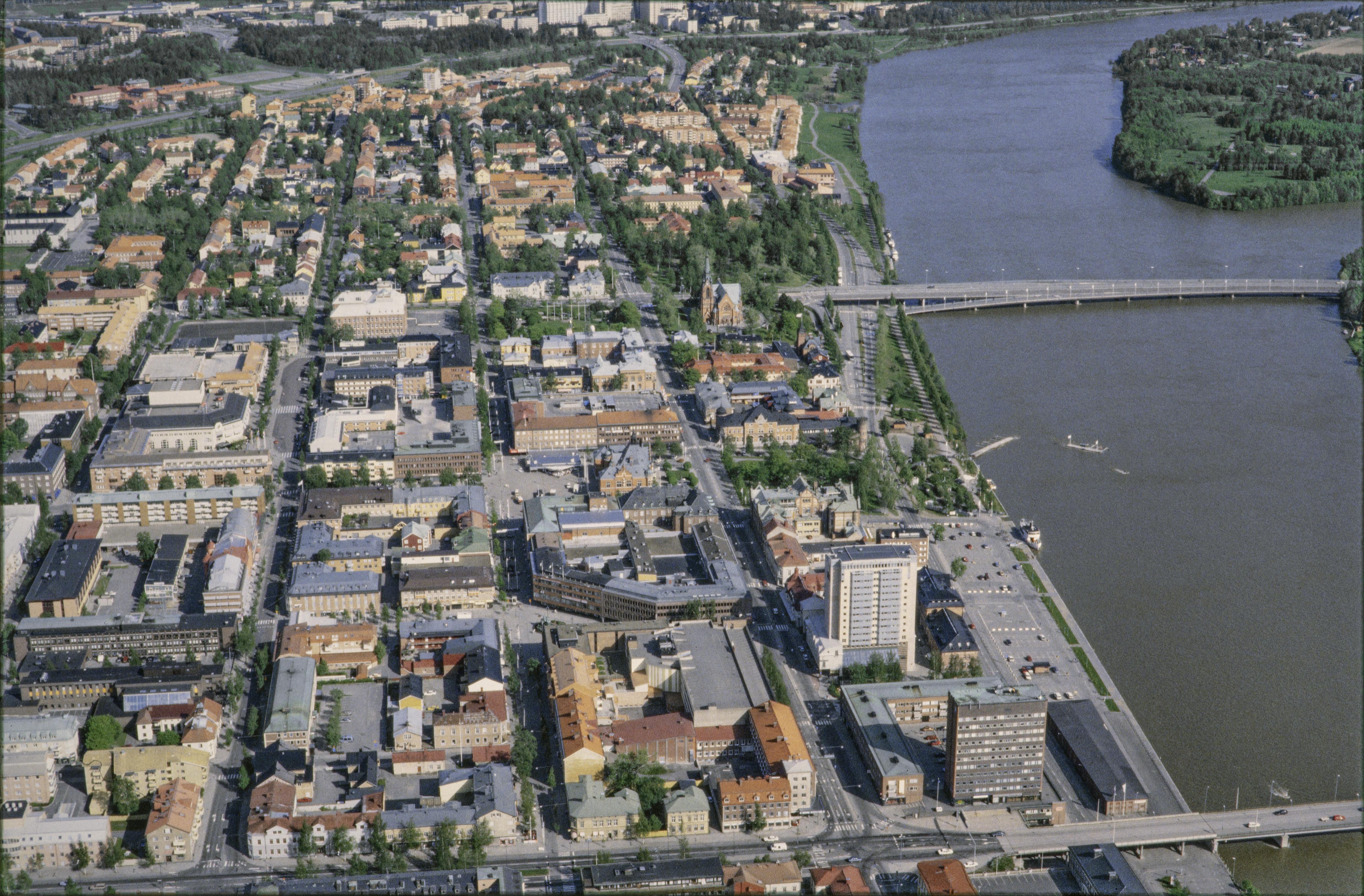 Beskrivning: Umeälven i Umeå stad. Till höger över bildens mitt Kyrkbron och Umeå Stads kyrka i Umeå stads centrum / stadslager RAÄnr Umeå stad 128:1. I bildens övre del högskoleområdet (Konsthögskolan och Designhögskolan). Bilden är tagen mot (väderstreck): SO