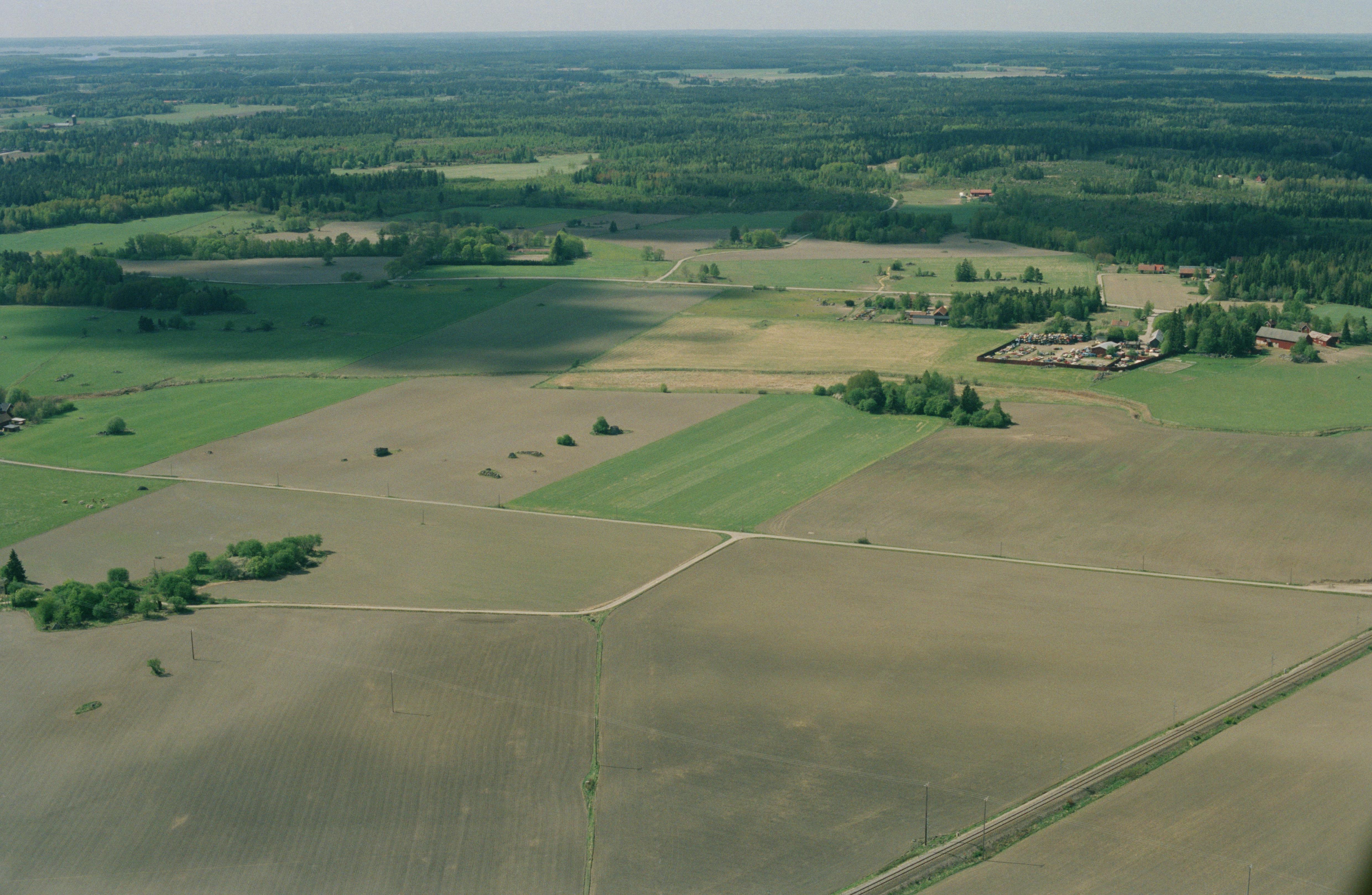Beskrivning: Bygge av väg E18 vid Mälby, väster om Nibble och Ullbro. Vid bildens mitt område med hällristningar RAÄnr Tillinge 380, 381, 382, 393 m.fl. Bilden är tagen mot (väderstreck): SSV
