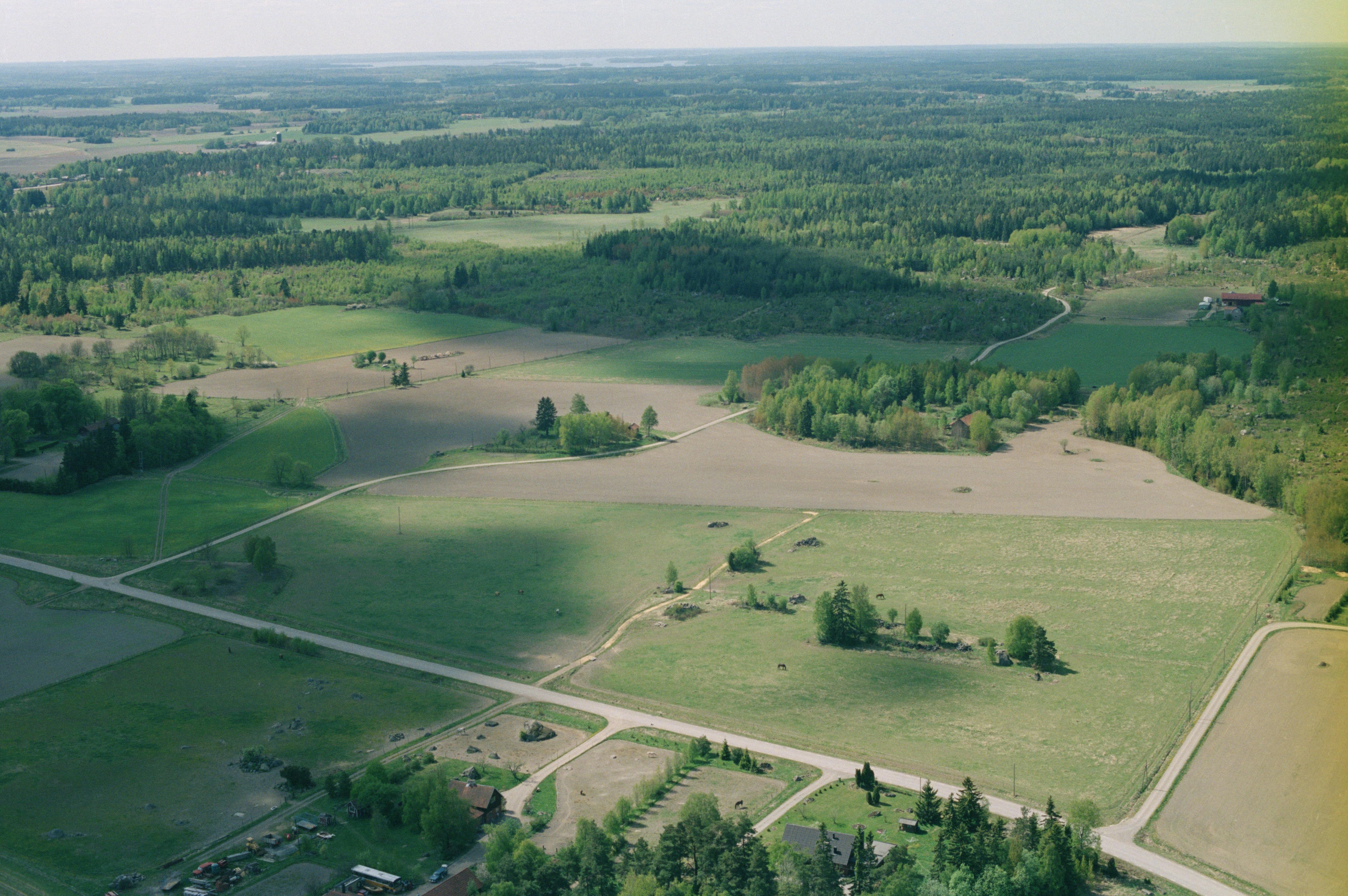 Beskrivning: Mälby innan vägbygge av E18 i området. Vid bildens mitt boplats RAÄnr Tillinge 327 och 366 m.fl. Uppe till höger Posttorpet. Bilden är tagen mot (väderstreck): SV