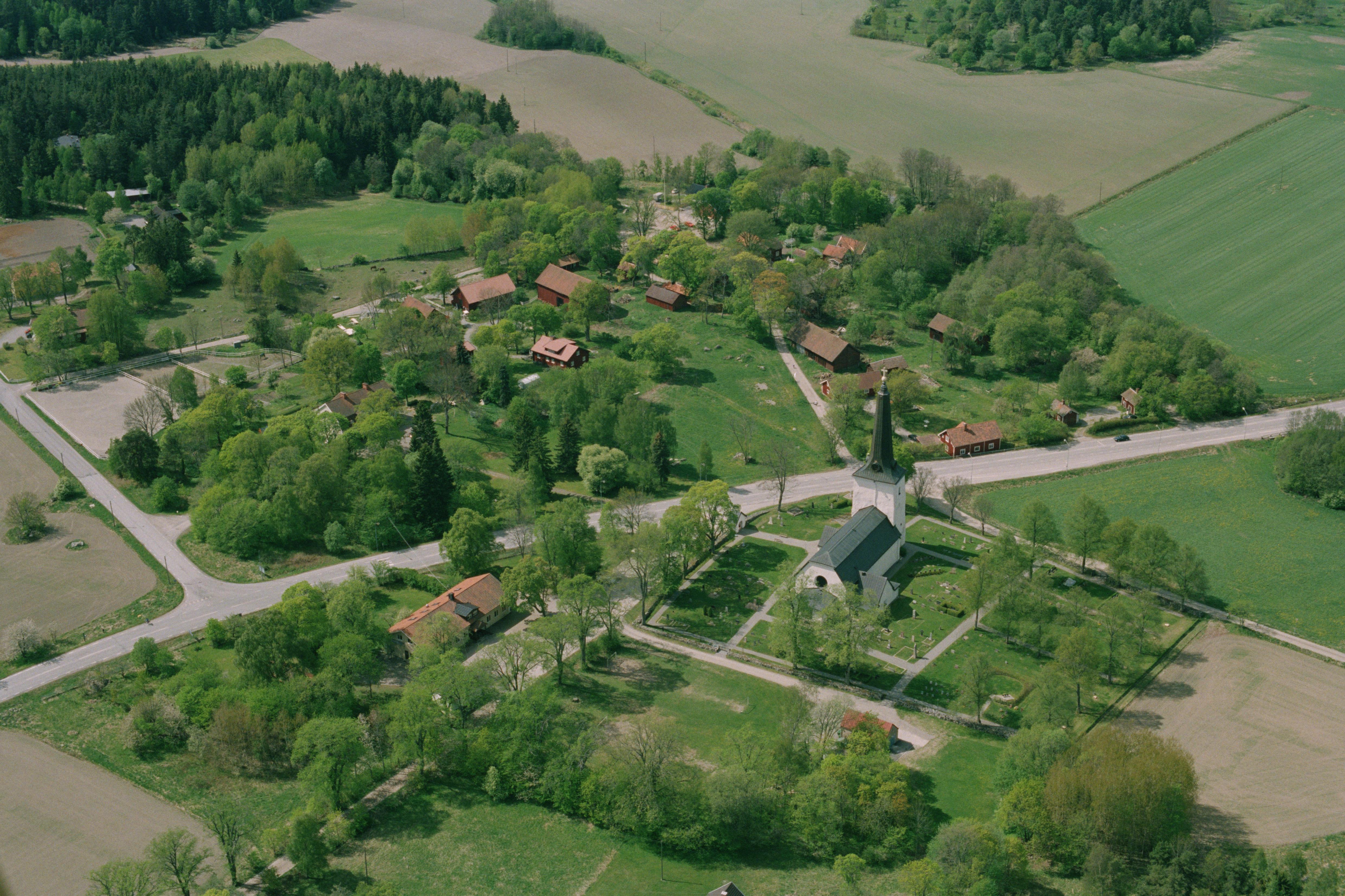 Beskrivning: Irsta tätort. Vid bildens mitt Irsta kyrka i Gullbobäckens dalgång. Bilden är tagen mot (väderstreck): VSV