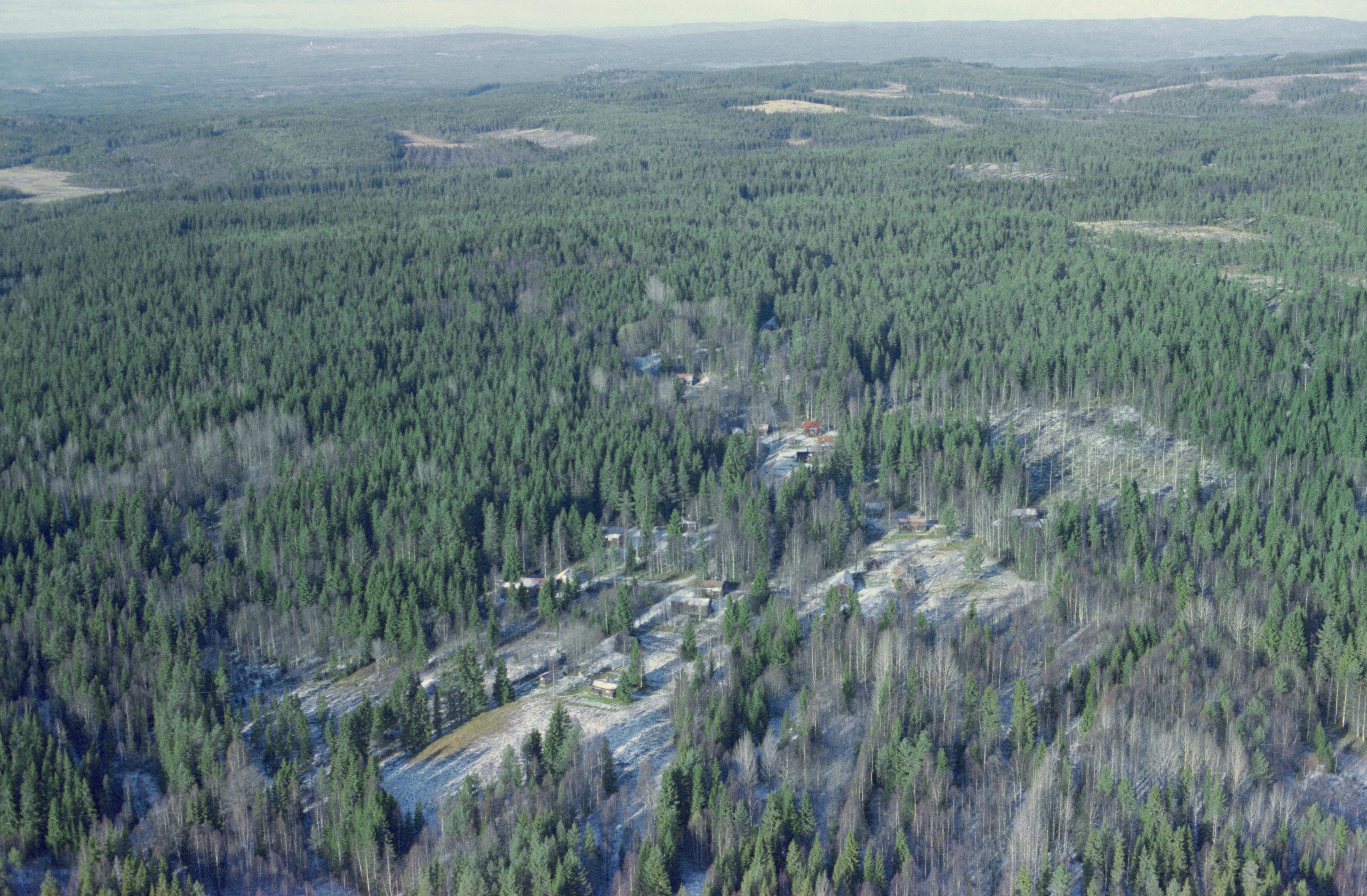 Beskrivning: Fäbodsbyn Ärtled vid Gubberget. Till höger om bildens mitt fäbodsområdet RAÄnr Rättvik 247:1. Uppe till vänster skymtar byn Boda och till höger sjön Ljugaren. Bilden är tagen mot (väderstreck): N
