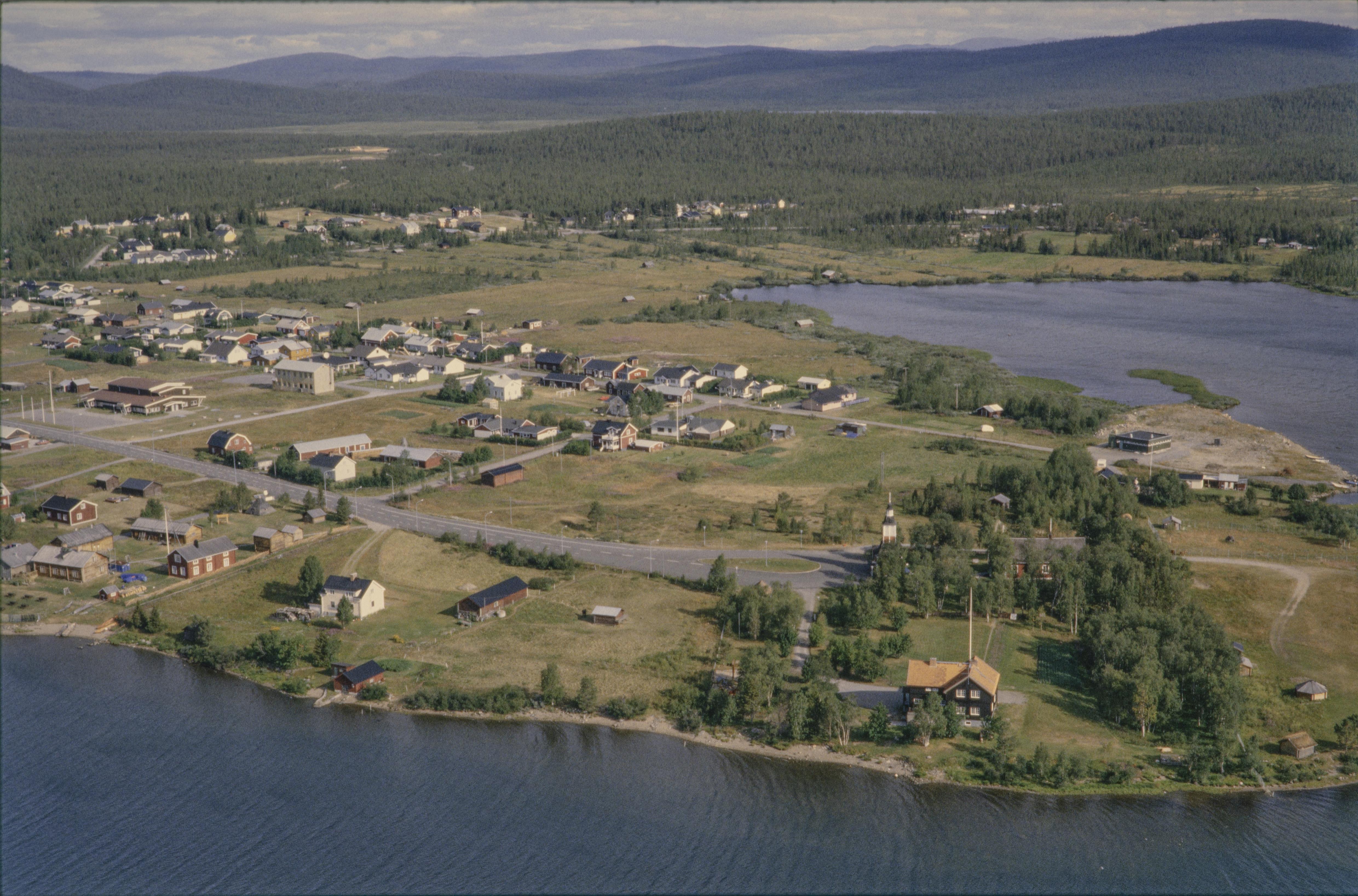 Beskrivning: Jukkasjärvi (Cohkkiras) kyrkby vid Torneälven (Duortnoseatnu), sjöarna Jukkasjärvi (Cohikkirasjávri) och Sautusjärvi. Till höger under bildens mitt Jukkasjärvi kyrka vid kyrkplats RAÄnr Jukkasjärvi 2516. Bilden är tagen mot (väderstreck): NNV
