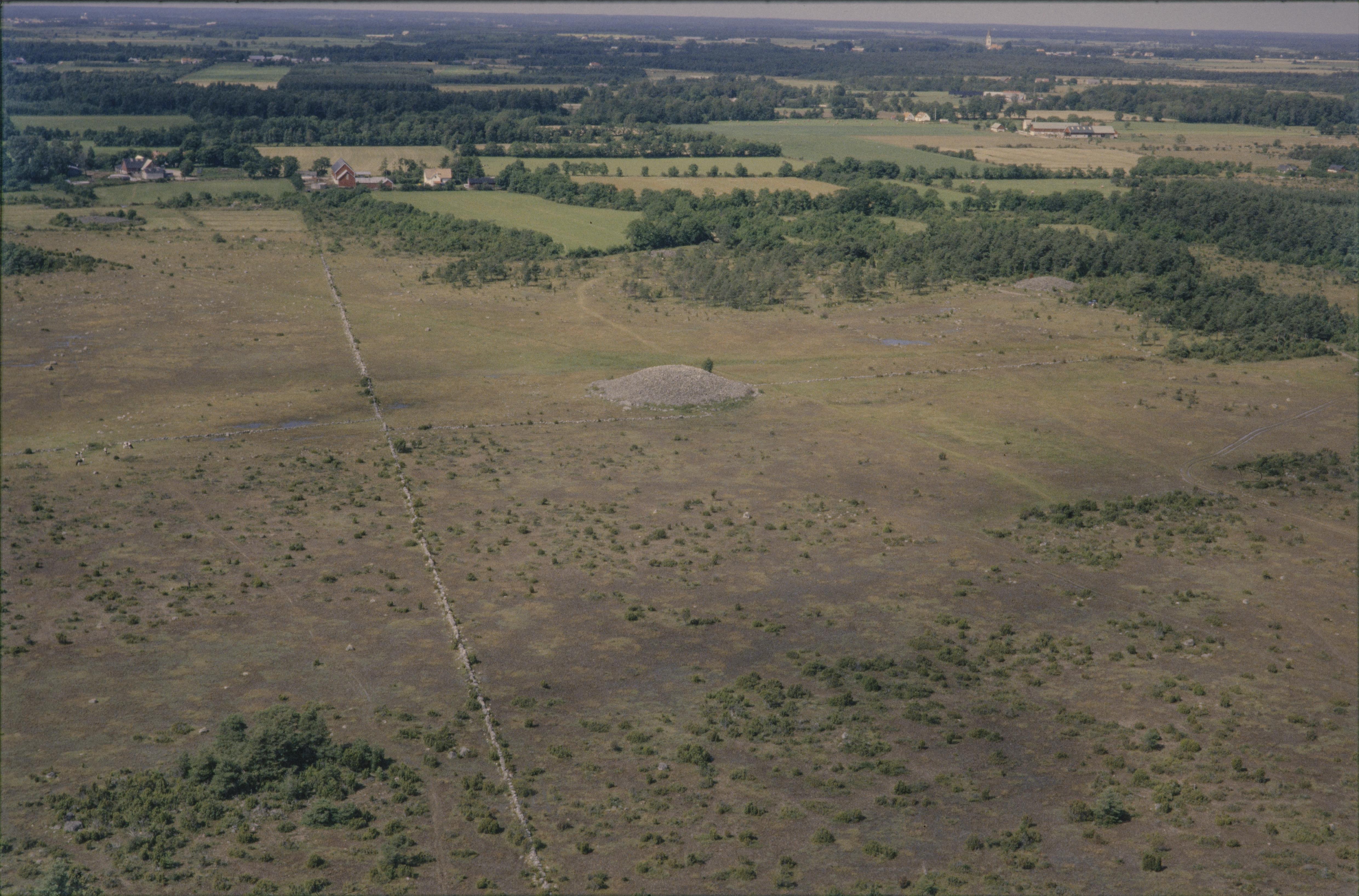 Beskrivning: Uggårde gård uppe till vänster. Vid bildens mitt gravröset RAÄnr Rone 10:1 Uggarde rojr (skrivs även: Uggarde råir / Uggarderojr / Uggarderåjr m.m.). Rone kyrka till höger uppe i bildens övre kant. Bilden är tagen mot (väderstreck): N