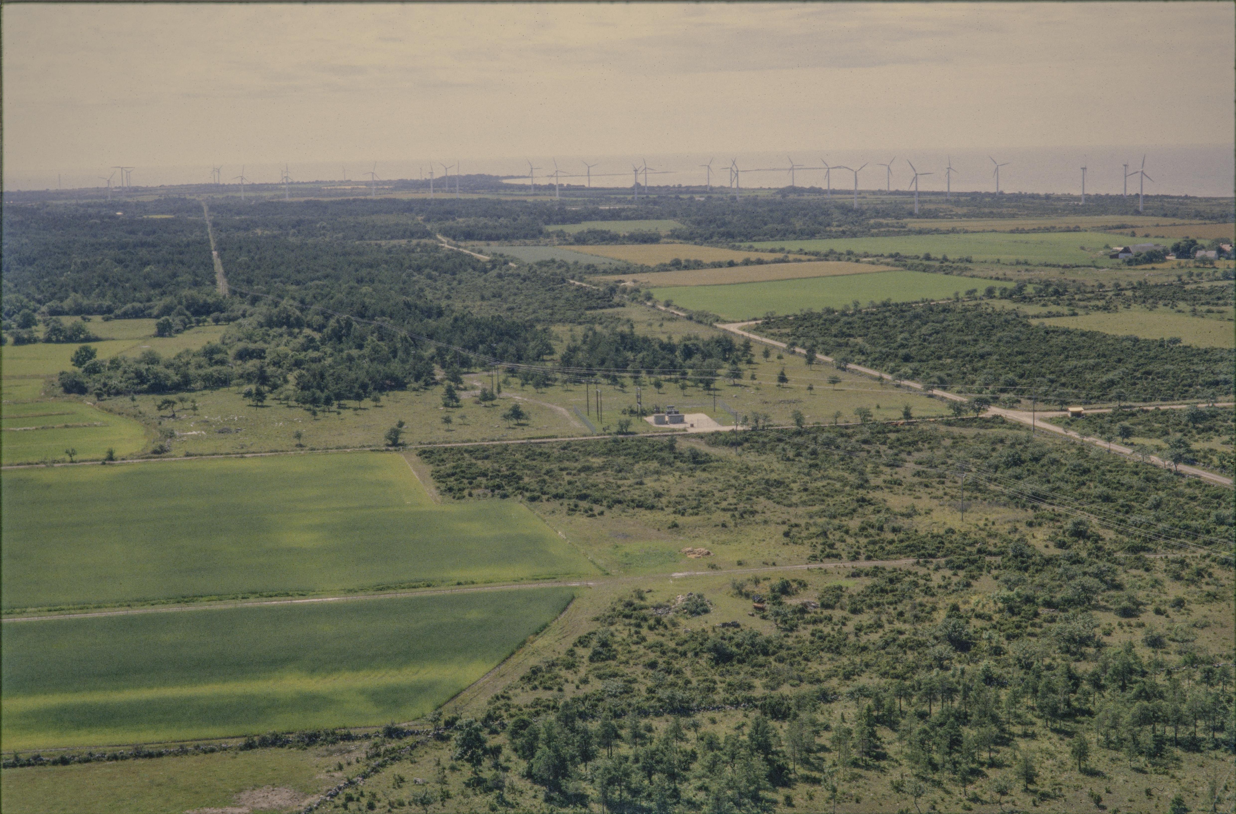 Beskrivning: Vindkraftverk på Näsudden. I bildens nedre del område sydväst om Näs kyrkby. Gården Stora Siglajvs uppe i bildens högra kant. Vid bildens mitt fyndplats (dolkklinga av brons) RAÄnr Näs 80:1. Bilden är tagen mot (väderstreck): SSV