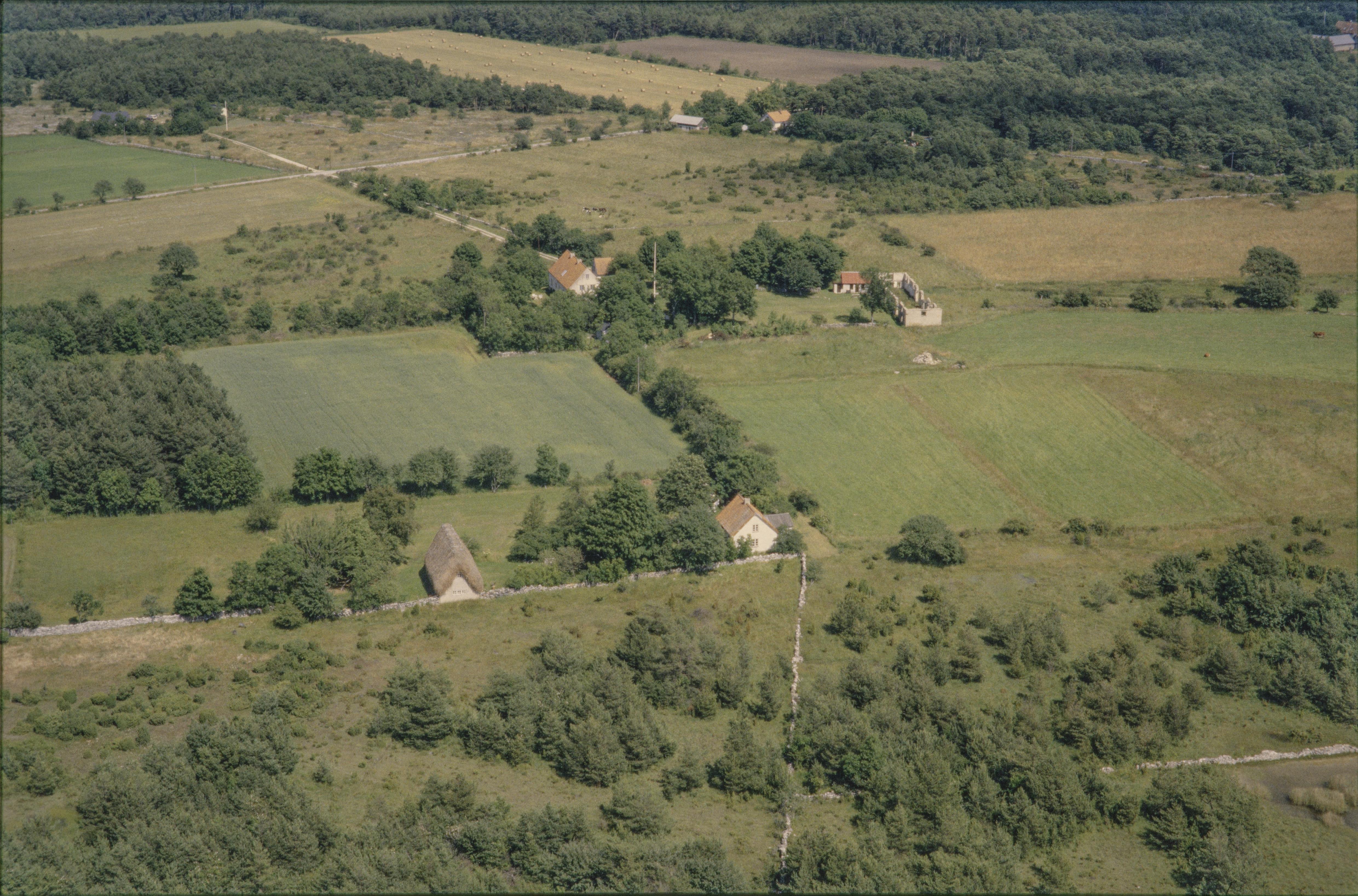 Beskrivning: Området Sippmanne i Gervalds by. Över bildens mitt Sippmanne medeltida husgrund (med delvis bevarade murar) RAÄnr Vamlingbo 63:1. Bilden är tagen mot (väderstreck): NO
