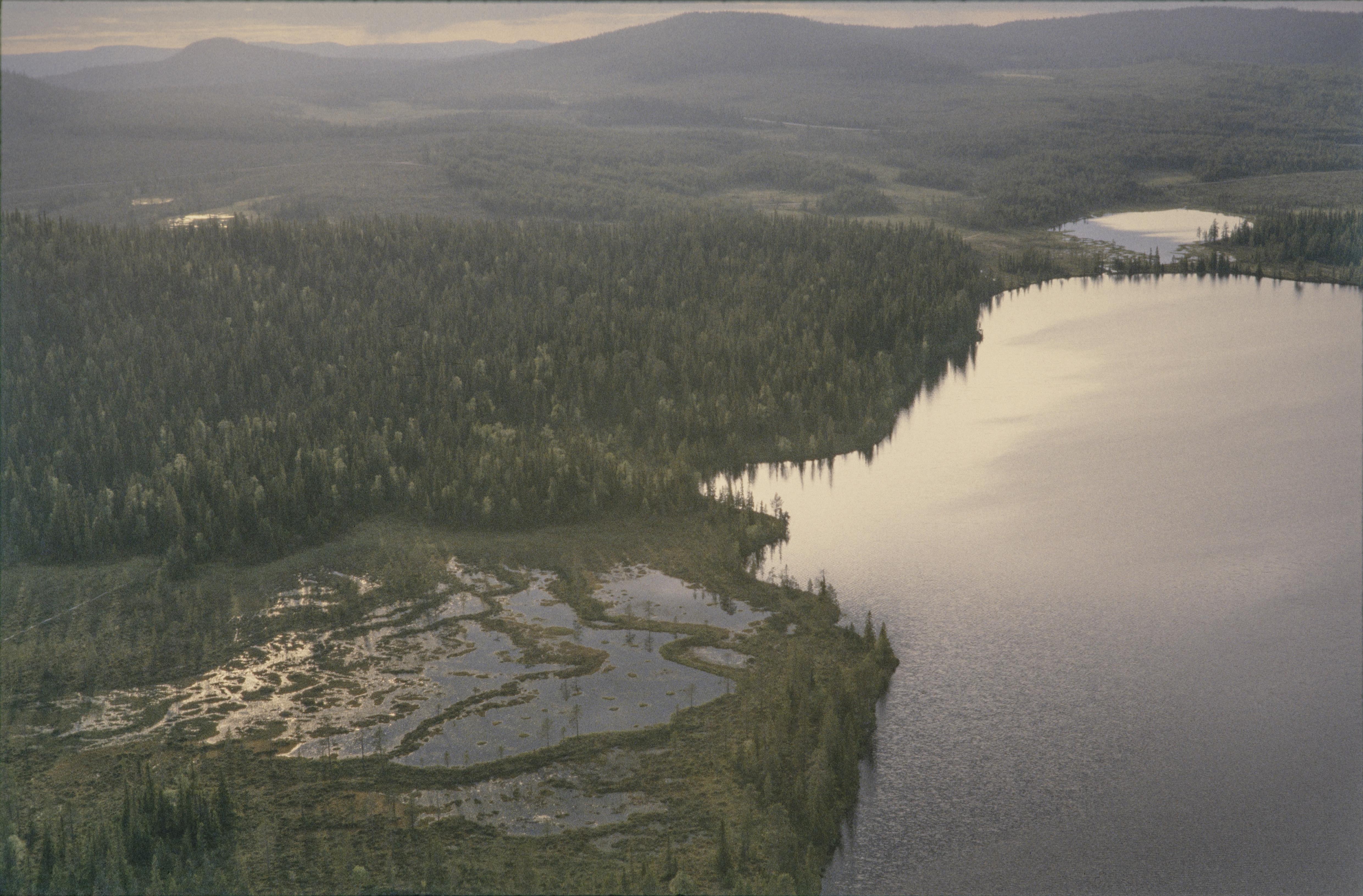 Beskrivning: Geijaurevallen, en renvall vid sjön Geijaure (Giejjure). Till vänster om bildens mitt bergsområdet Giejjavárrie. Bilden är tagen mot (väderstreck): NNV