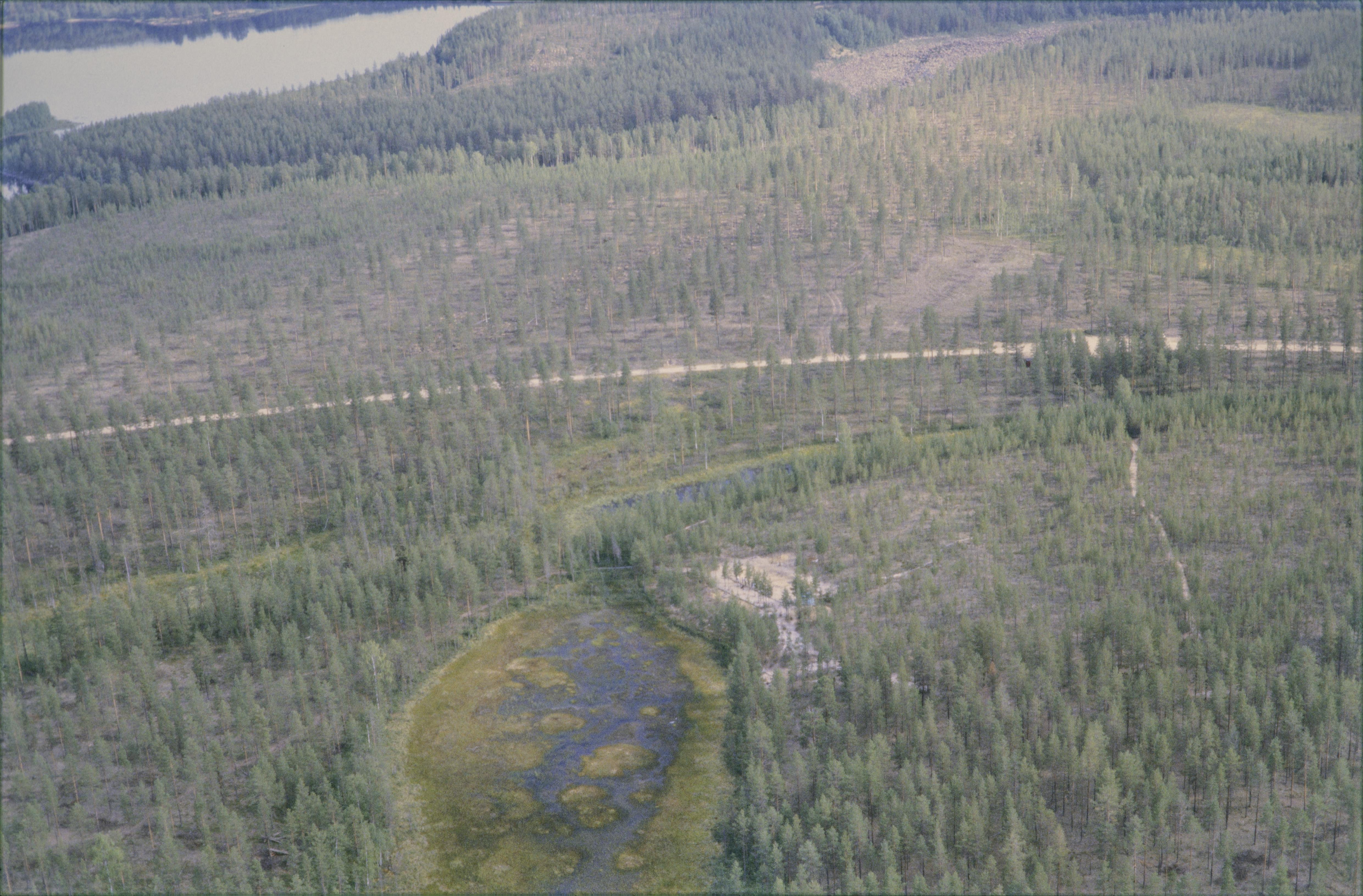 Beskrivning: Under bildens mitt Vuollerimboplatsen, en stenåldersboplats med hyddbotnar och fångstgrop RAÄnr Jokkmokk 1292:1-2 norr om tätorten Vuollerim (Vuolleriebme). Vid boplatsen härd RAÄnr Jokkmokk 4935 och 4936. Stora Luleälven (Stuor Julevädno) i bildens övre del. Bilden är tagen mot (väderstreck): OSO
