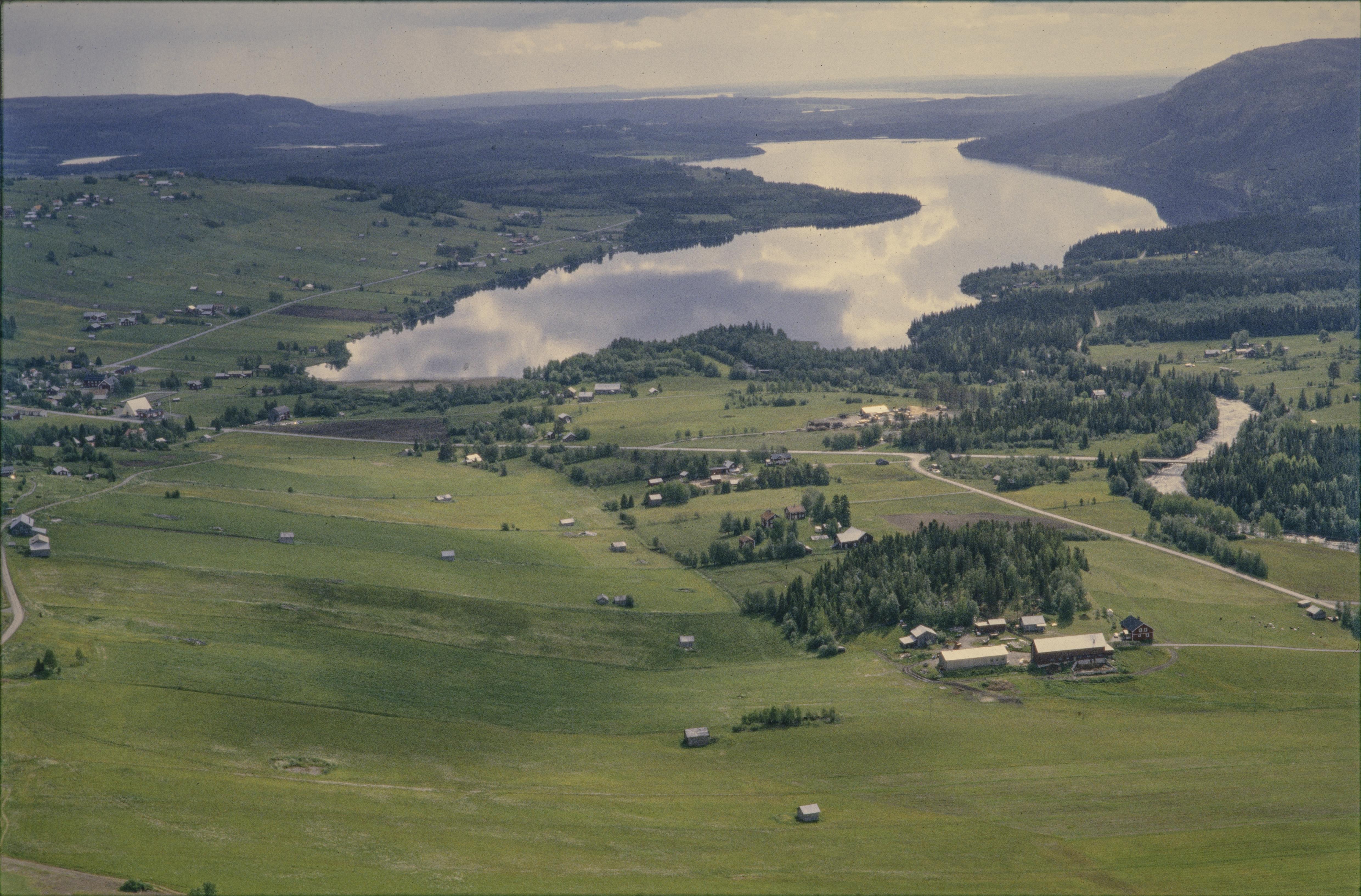 Beskrivning: Orten Kaxås vid Åfloåns utlopp i Hällsjön. Nygården till höger i bildens nedre del. I mitten av högra bildkant hammarområde RAÄnr Offerdal 164:1 vid Åfloån. Bilden är tagen mot (väderstreck): OSO