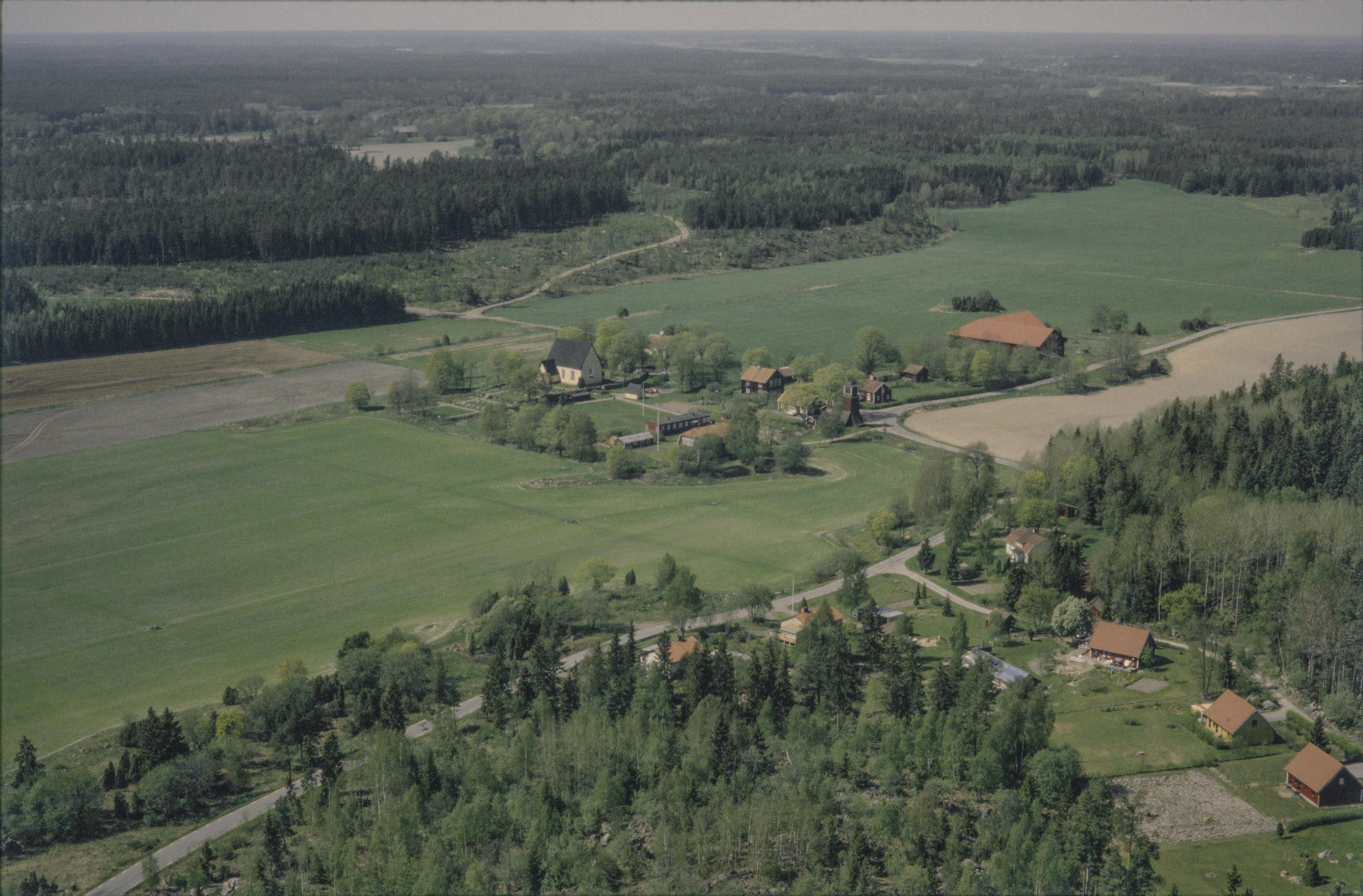 Beskrivning: Bladåkers kyrka i kyrkbyn Bladåkersby. Faringe socken i bildens övre kant. Bilden är tagen mot (väderstreck): SV